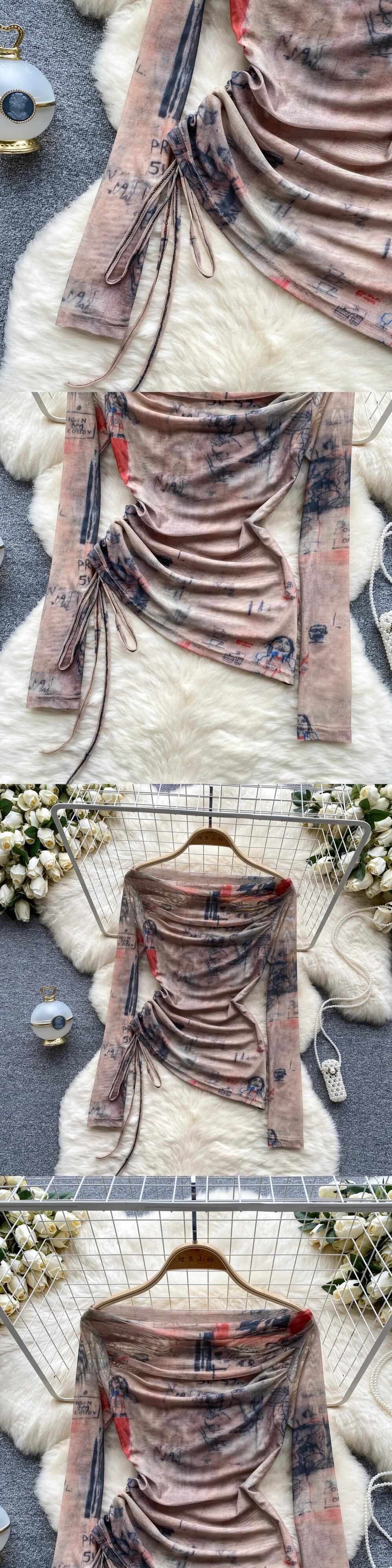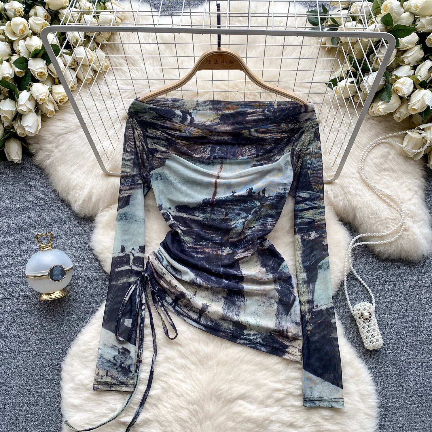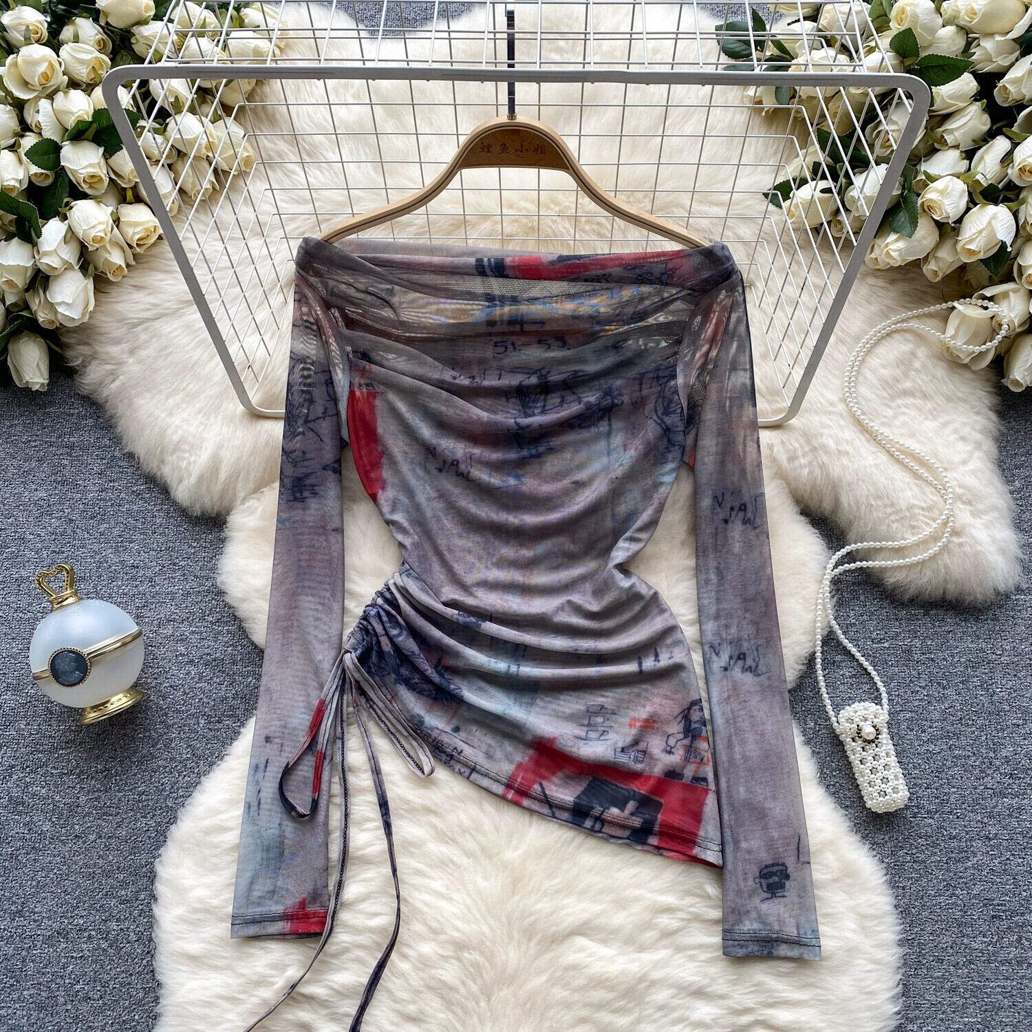 ヨーロッパとアメリカのネクタイスタイルの絞り染めワンショルダーTシャツの女性、秋の巾着、純粋な欲望のデザイン、ニッチな気質、シックなトップ オータム 秋物 ピュア ヨーロピアン lyxaj70408123587