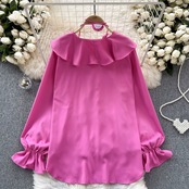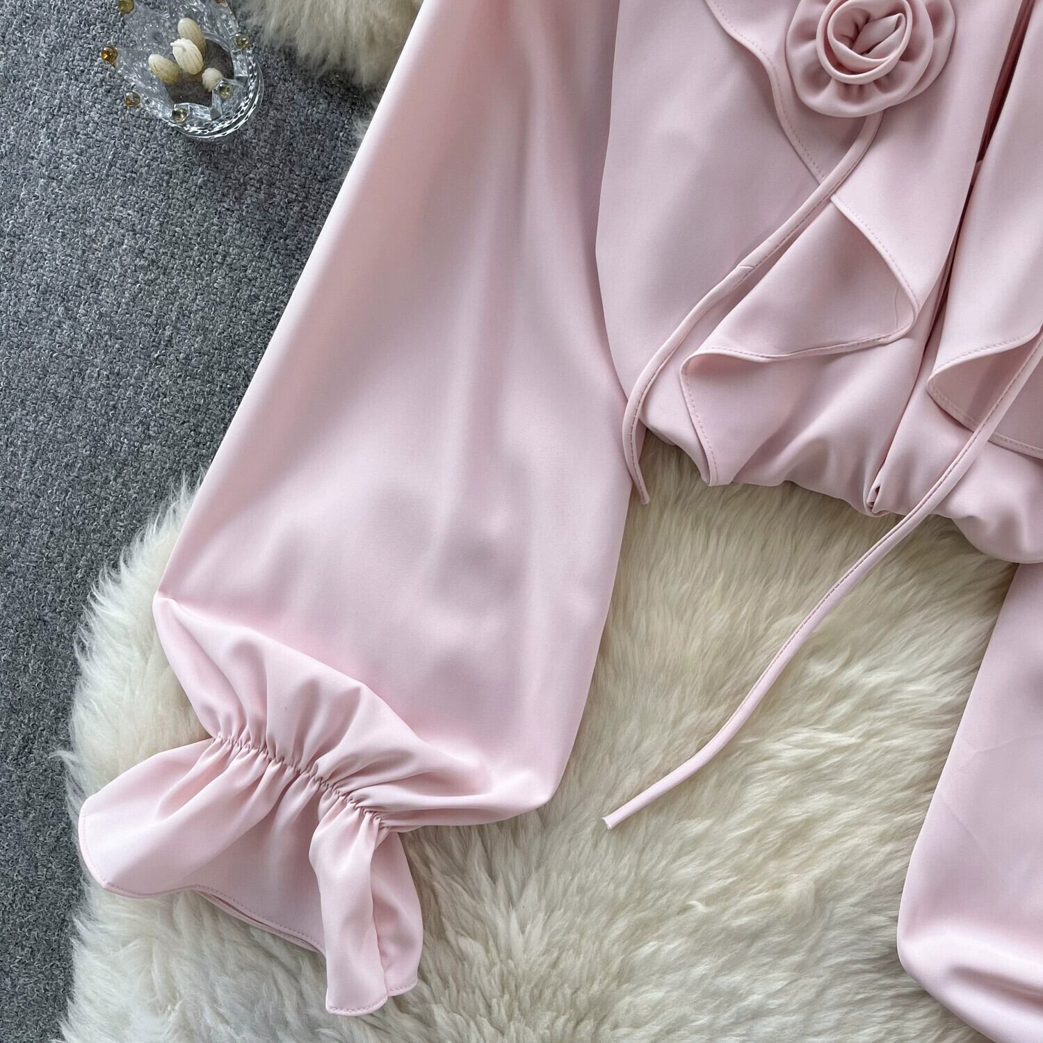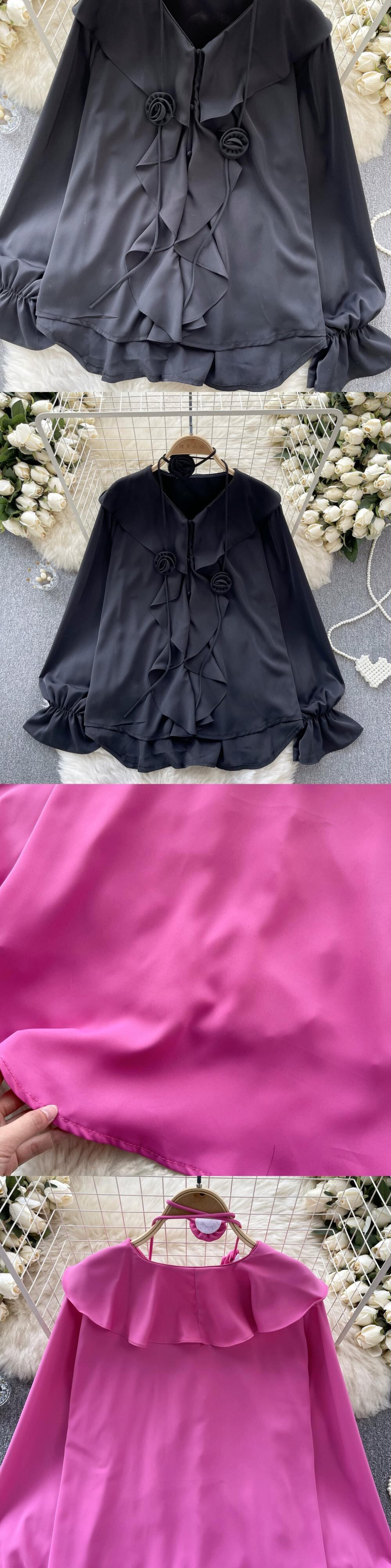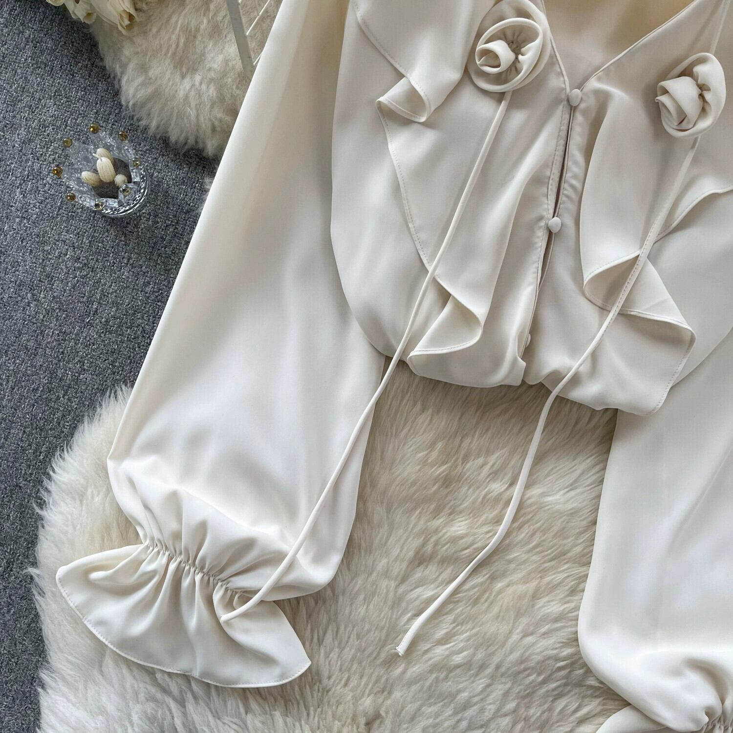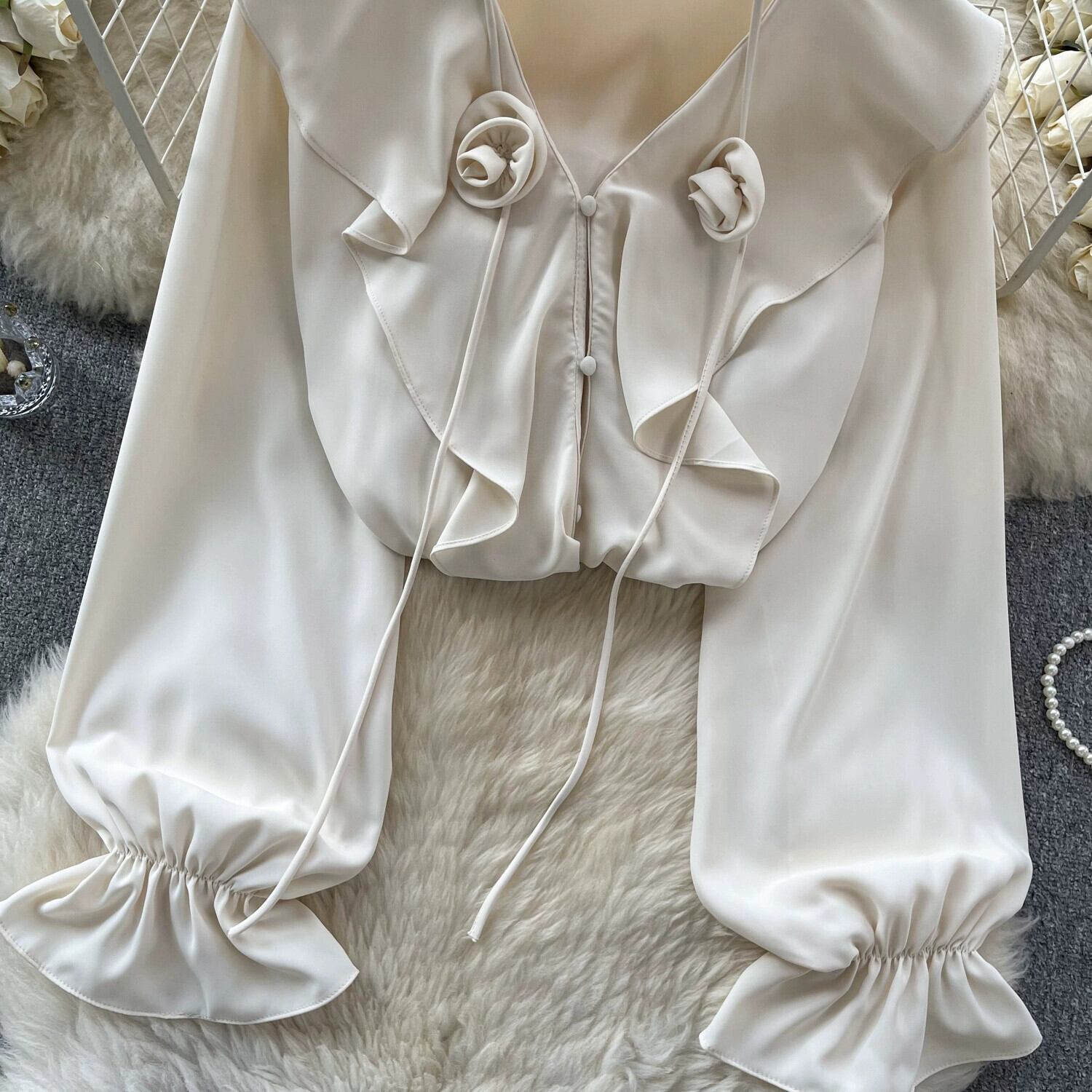 2024 早春フレンチシャツ女性の立体フラワーフリルスリムフィット多用途パフスリーブトップ女性 スプリング 春物 フラワーデザイン lyxaj92423903124