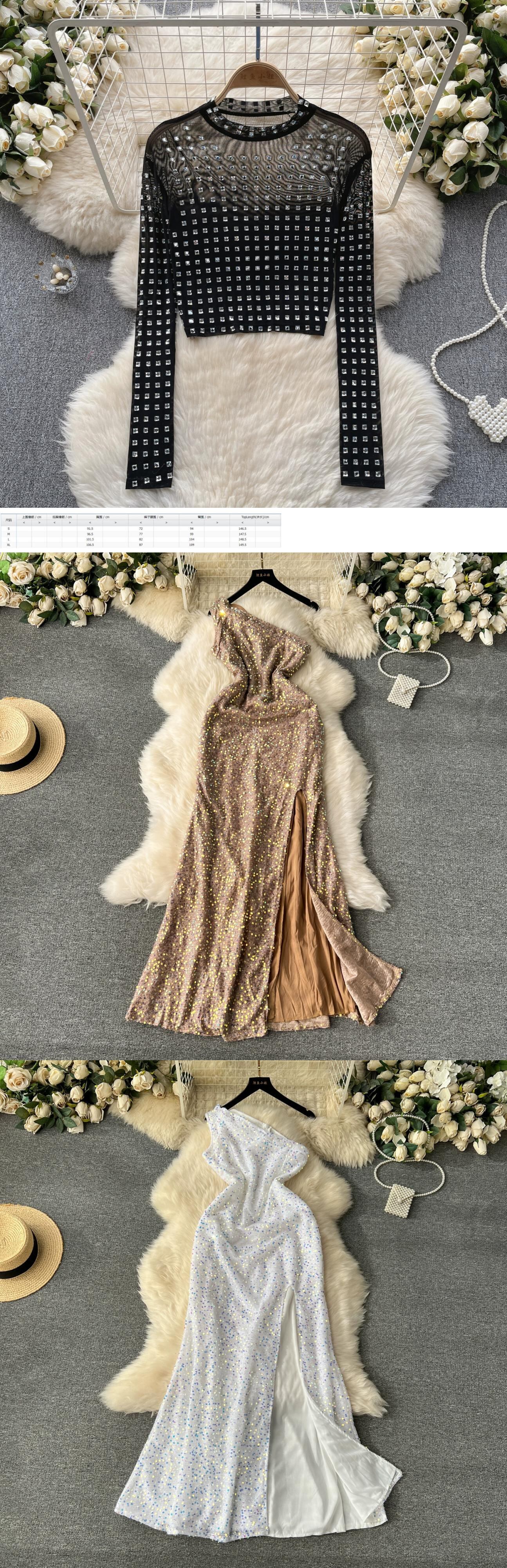 セレブスタイルのバンケットドレス、ハイエンドのライトラグジュアリーニッチ、スロープネック、オフショルダー、スリムフィットのロングスリットスパンコールドレス lyxaj61981256802