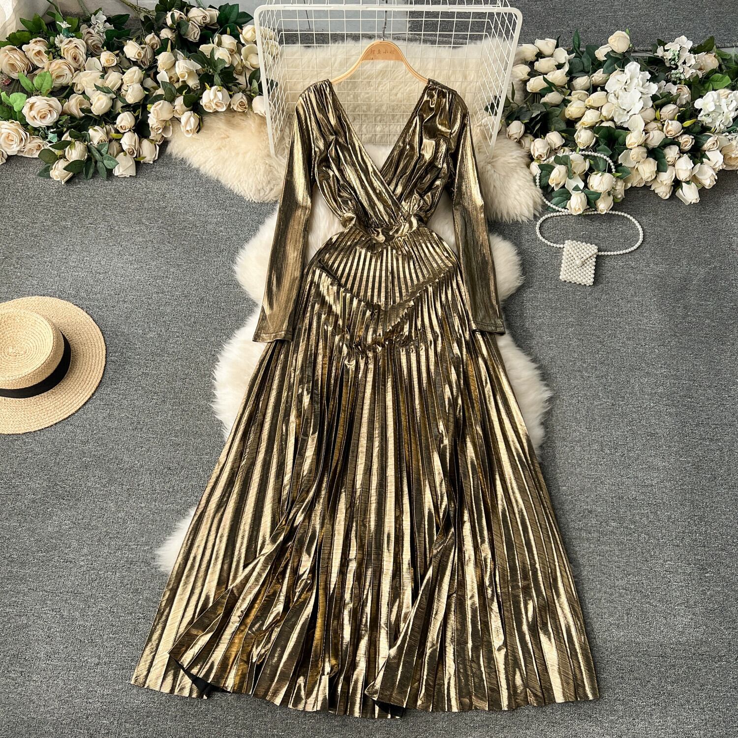 Clyゴールデンドレス、ハイエンドの軽い贅沢、ニッチ重工業、プリーツロングプリーツスカート、セクシーなVネック気質ドレス lyxaj73073813881