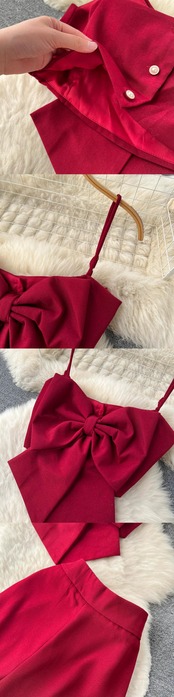 夏無地スーツ レディース 蝶ネクタイ ブラジャー サスペンダー トップ スリット ワイドレッグ パンツ ツーピース トレンド セット リボン サマー 夏物 ワイドパンツ ソリッドカラー lyxaj15963898190