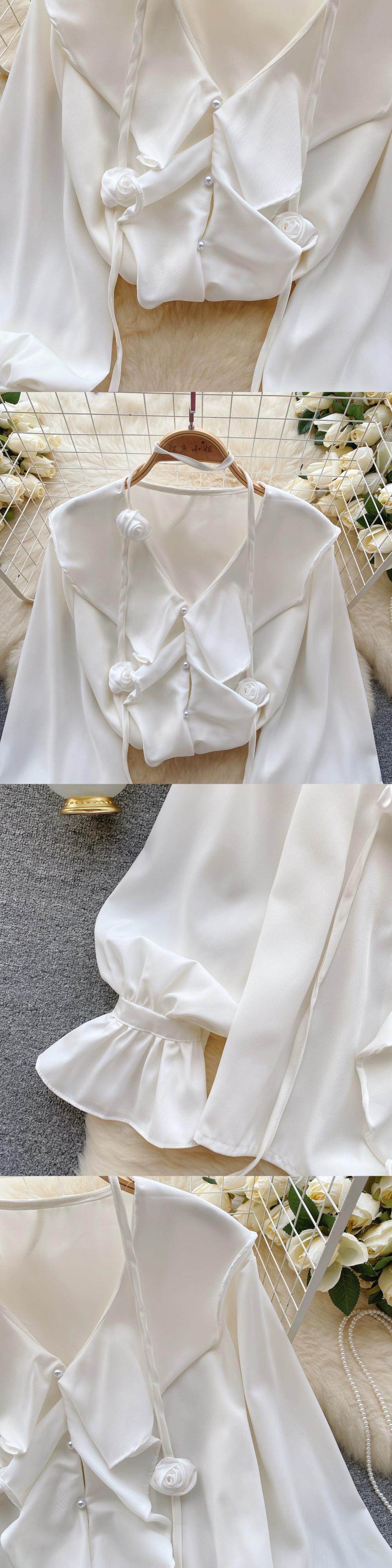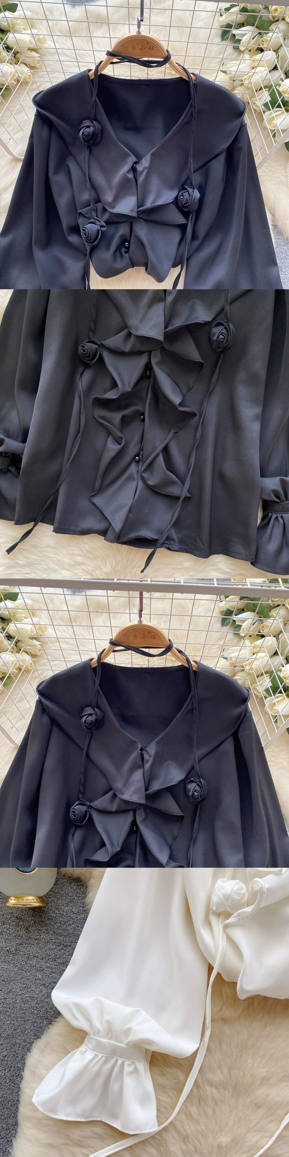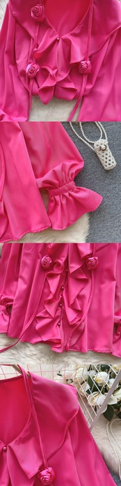 2024春の新しいスタイルのシャツレディース、甘いフリルVネック、年齢を軽減するパフスリーブ、ゆったりとした長袖トップス、トレンディな ロング 大人ガーリー スウィート キュート カジュアル スプリング 春物 lyxaj13631200410