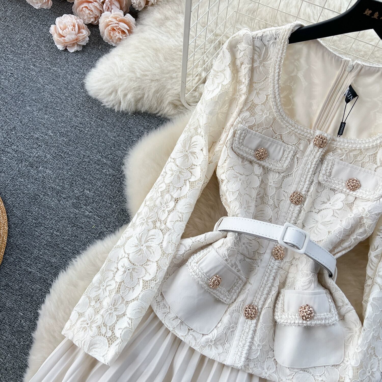 フレンチスタイルの香りの良いドレスの女性、ハイエンドの頑丈なビーズメタルバックルスクエアカラーレーススプライシングプリーツ妖精スカート スクウェア lyxaj59566176641
