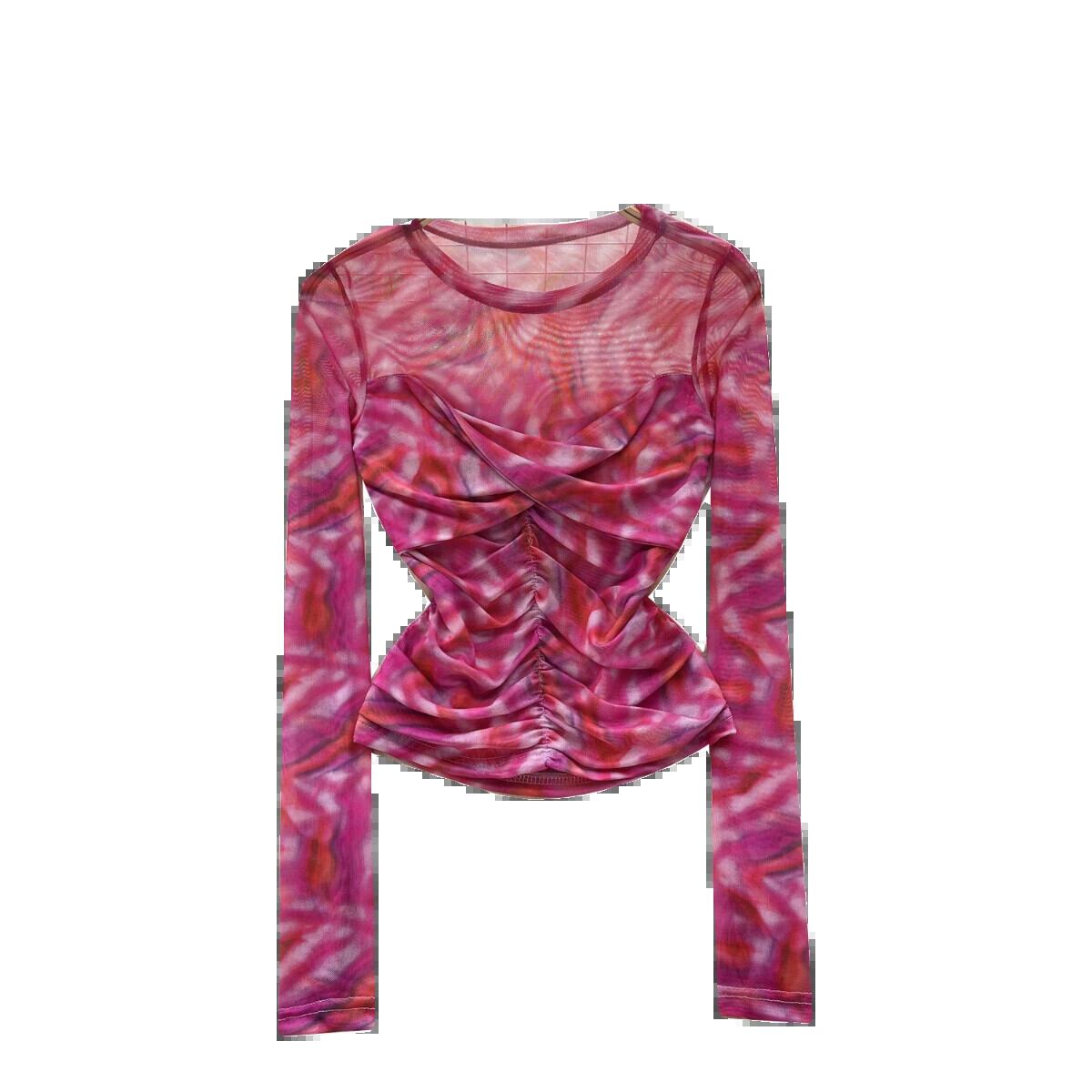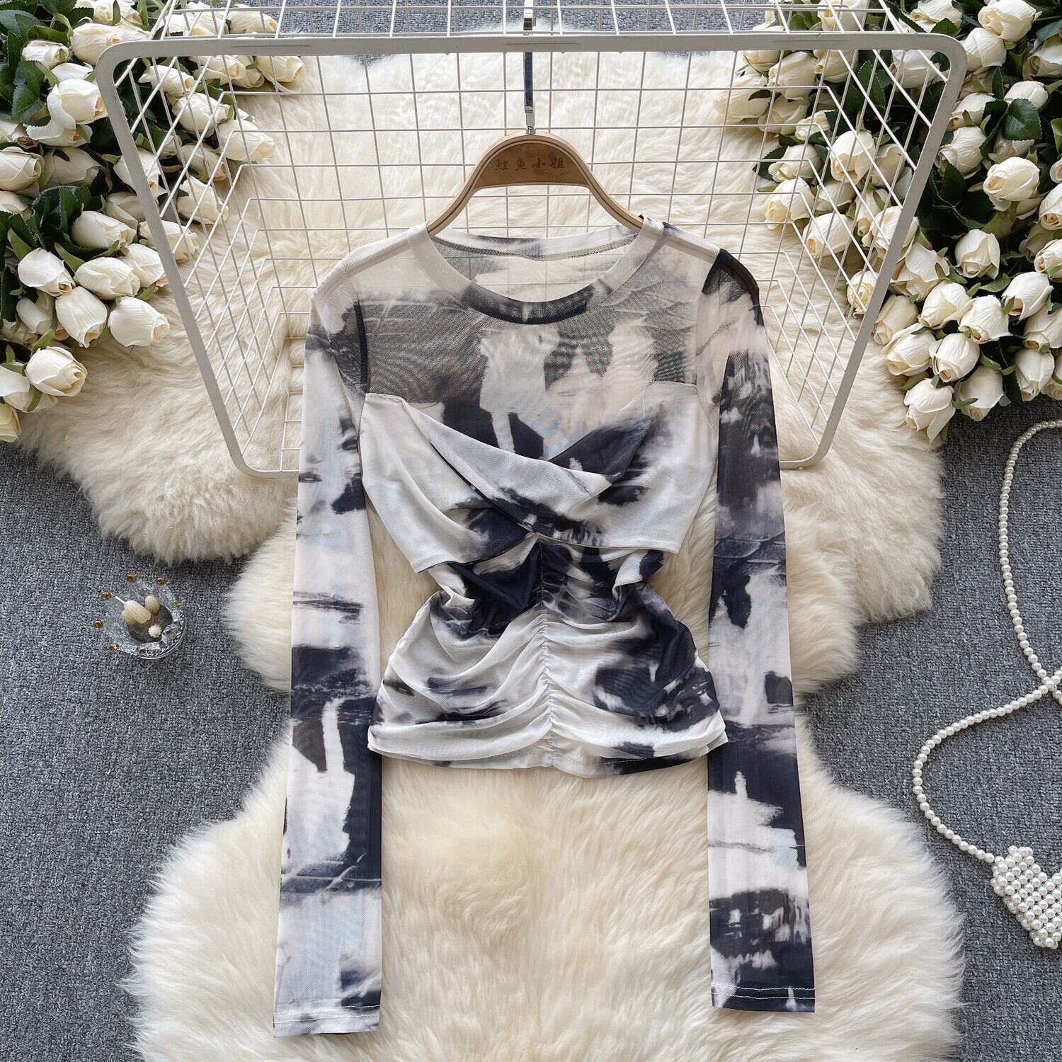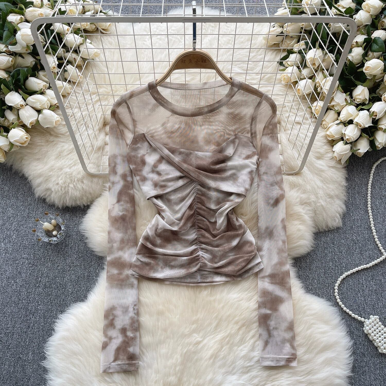 ヨーロッパとアメリカの長袖メッシュ T シャツ、スリム フィット、ラウンド ネック プリーツ タイダイ ボトム シャツ、ニッチ シック トップ ロング Oネック Tシャツ lyxaj17637607972
