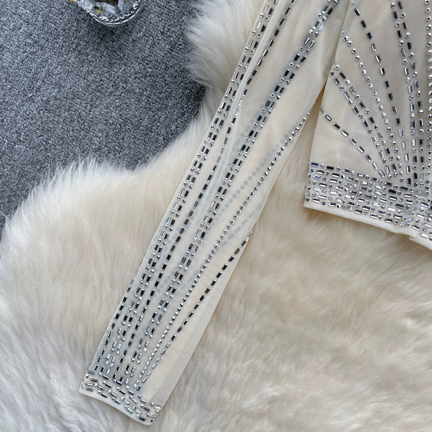ヨーロッパとアメリカのトップス春の女性のライト高級重工業ダイヤモンドスリムフィットショートセクシーなシースルーメッシュ長袖ボトシャツTシャツ ロング スプリング 春物 ヨーロピアン lyxaj56900626206