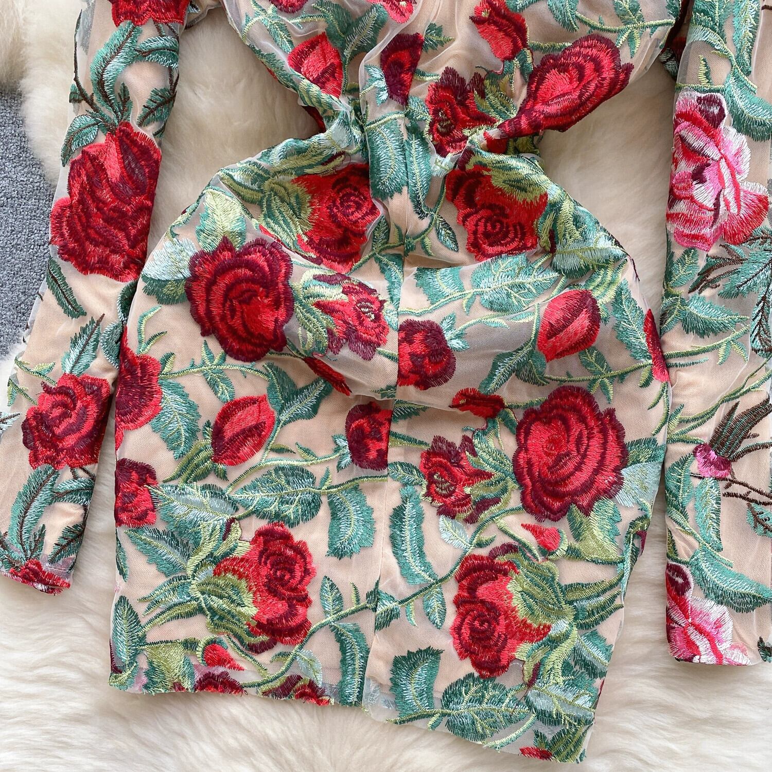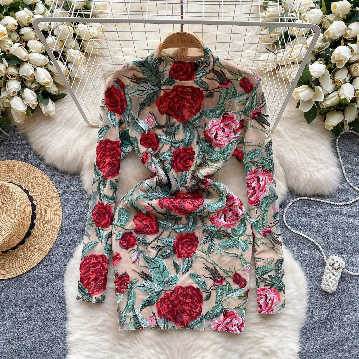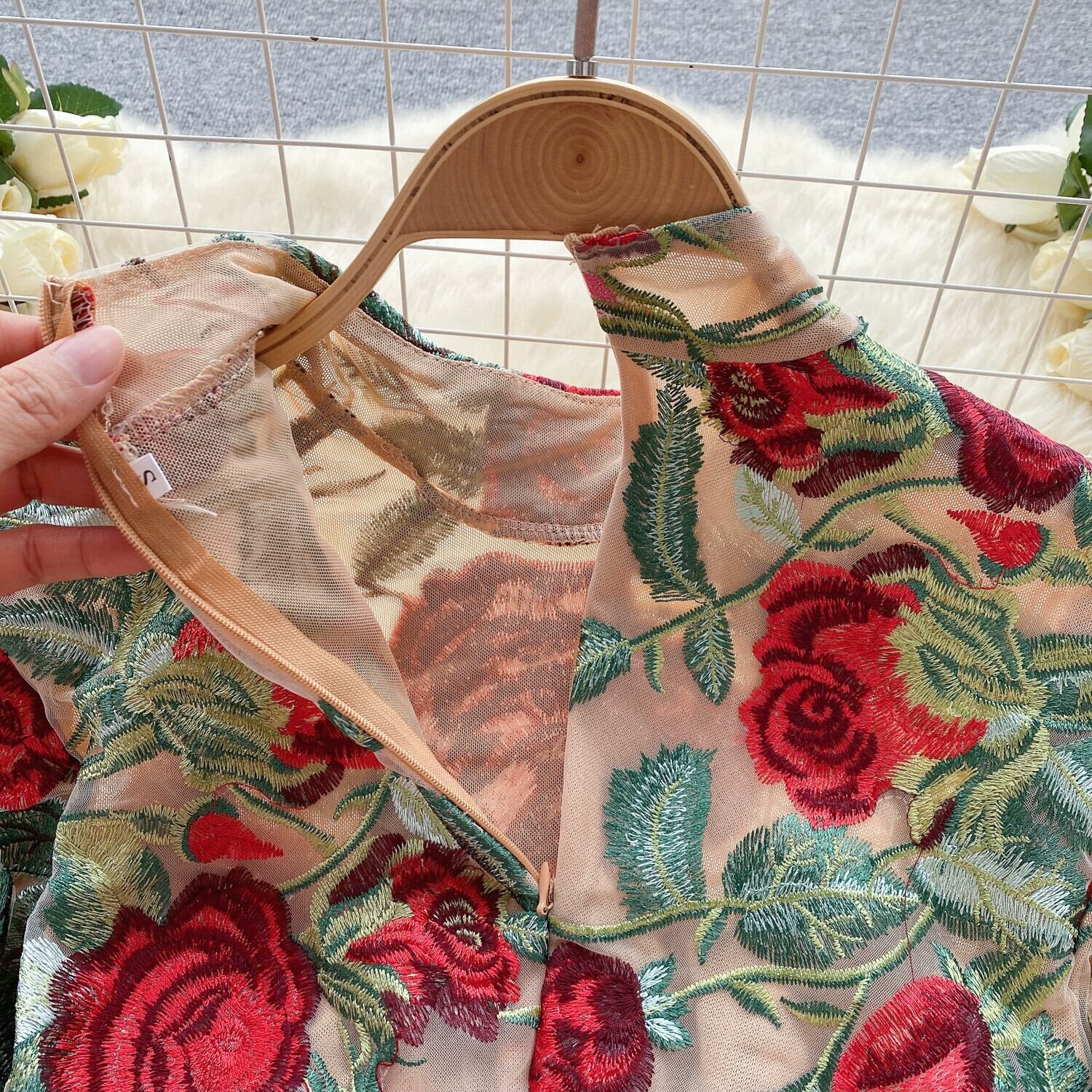 宮殿スタイルのレトロな重工業刺繍ドレスハイエンドライト高級ニッチ気質スタンドカラースリムショート刺繍ドレス レッド レース lyxaj94004248611
