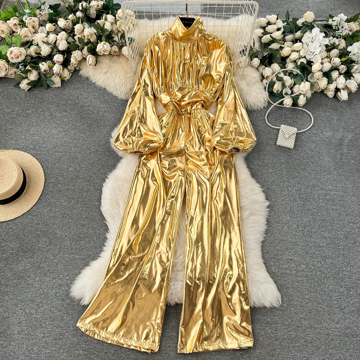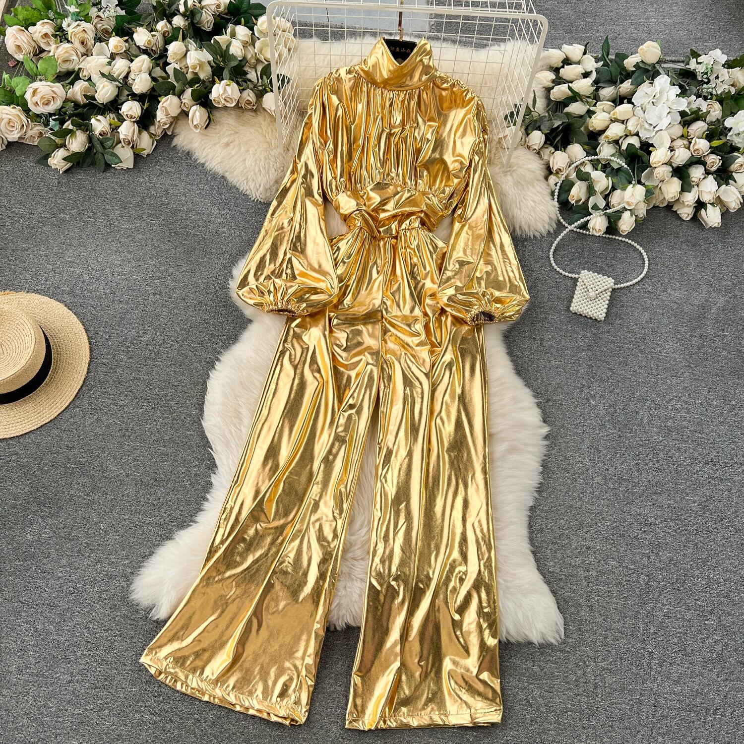 ヨーロッパとアメリカのジャンプスーツの女性、ライトラグジュアリー、ハイエンドの光沢のある、プリーツウエスト、スリミング、ロングワイドレッグパンツ、パフスリーブドレス ヨーロピアン lyxaj81462669010