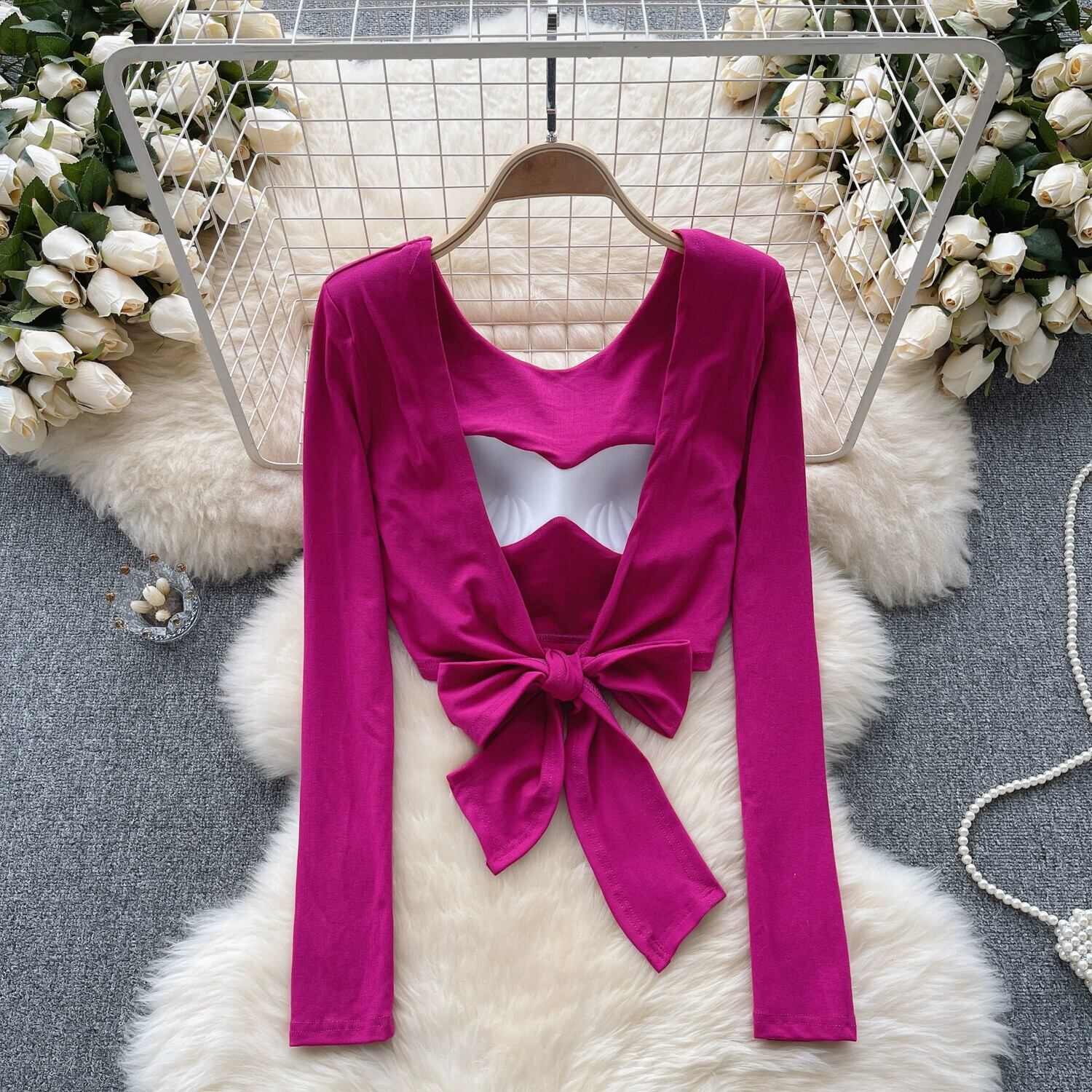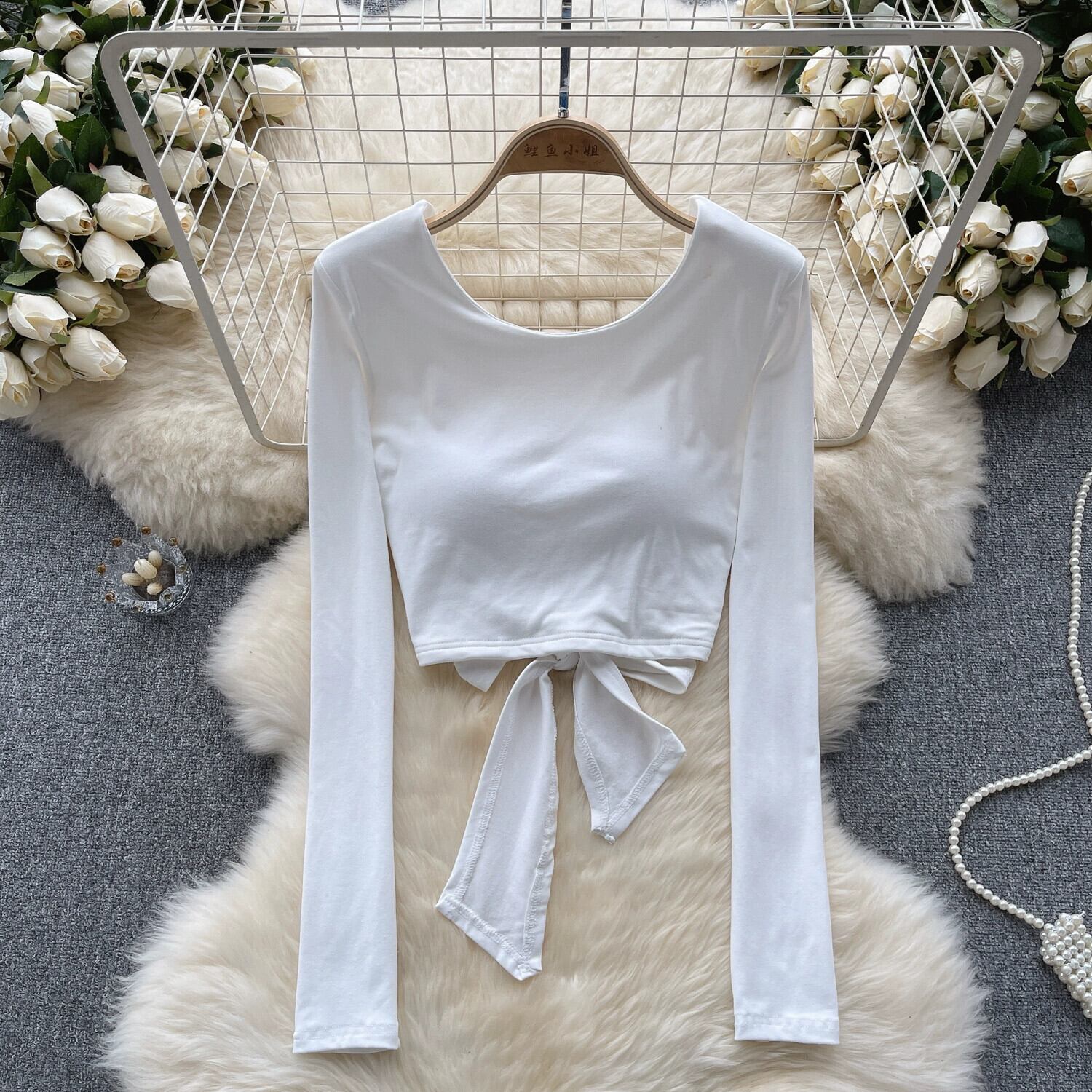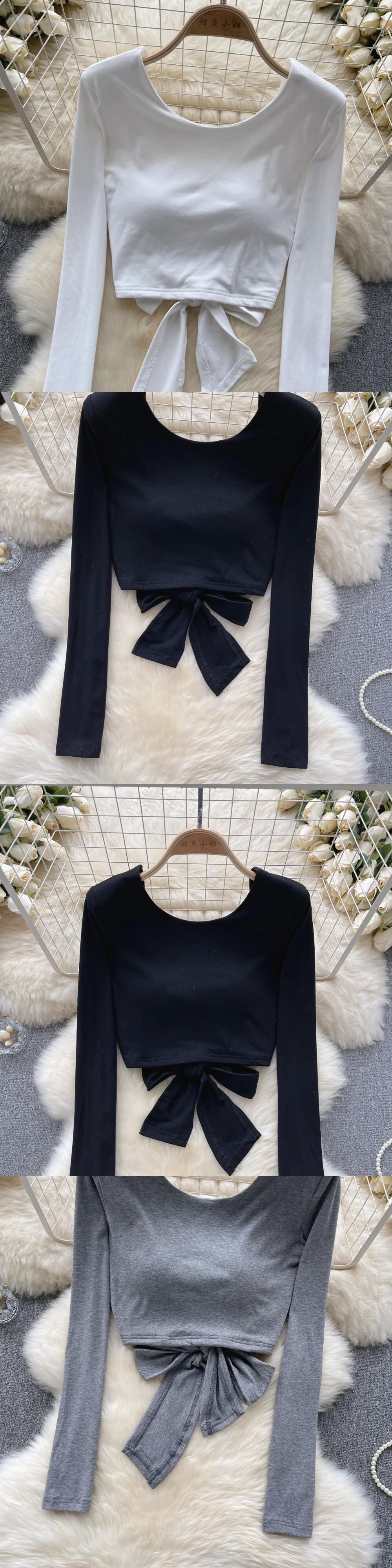 アメリカのレトロなネクタイスタイルのUネック長袖Tシャツの女性、秋のバックレスストラップデザイン、純粋で美しいショートトップ ロング オータム 秋物 ピュア lyxaj27999261836