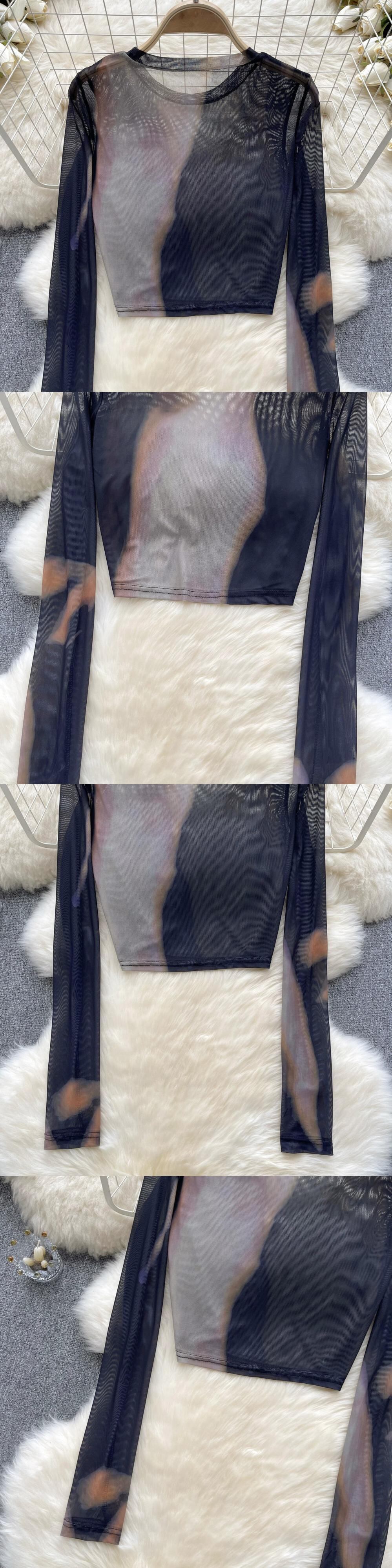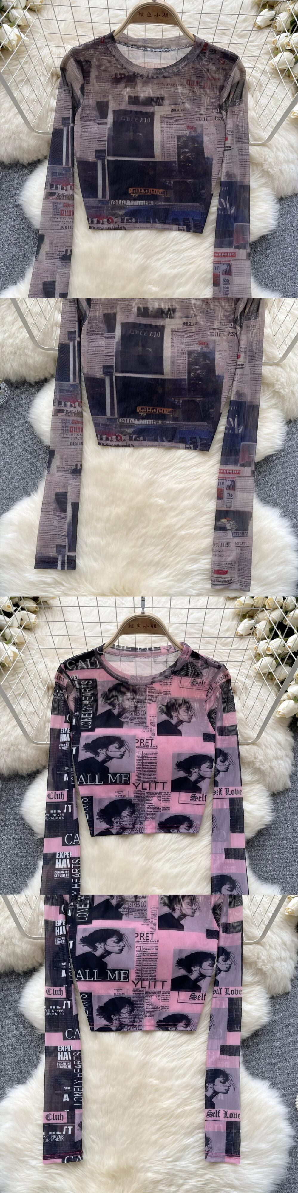 メッシュ長袖トップス女性 2023 新デザインニッチレトロプリントスリムショートボトムシャツトレンディなインナーウェア ロング lyxaj45254691121