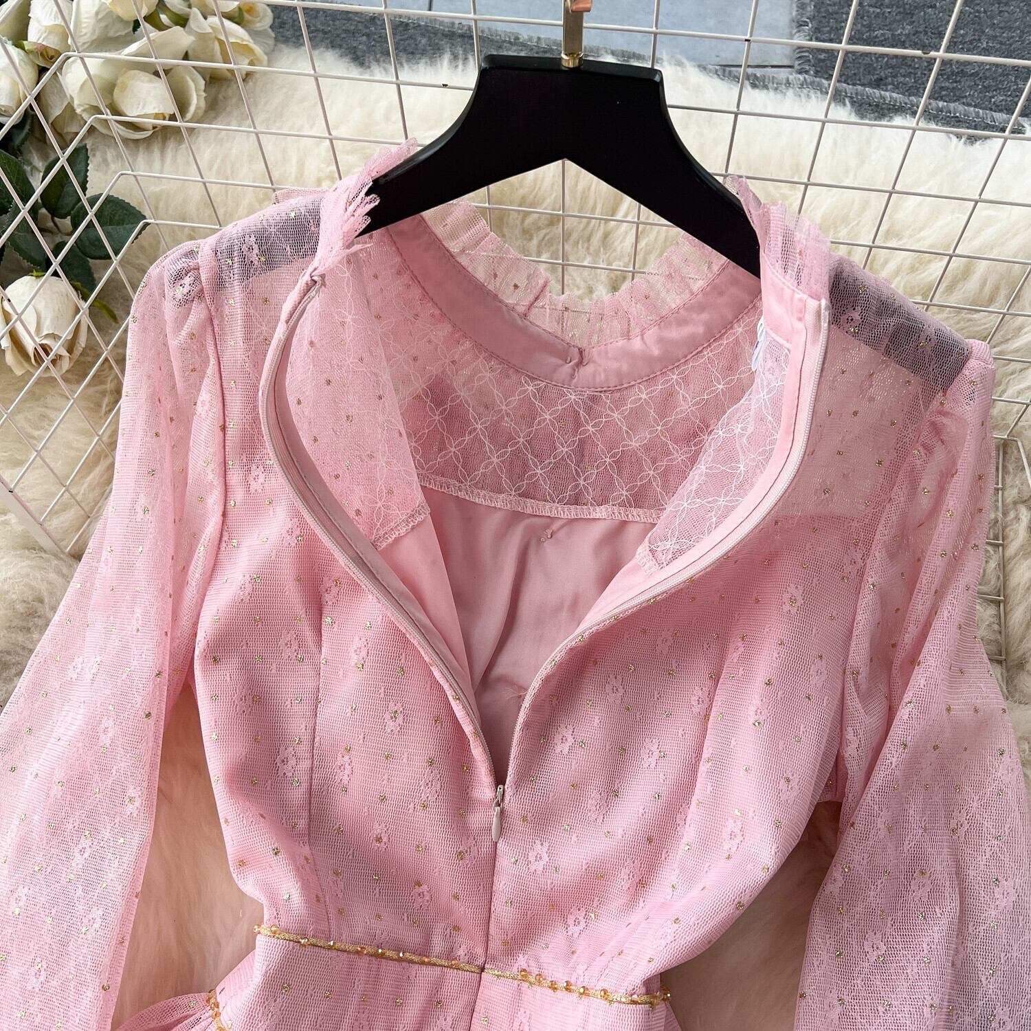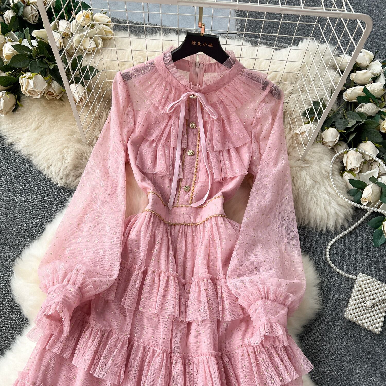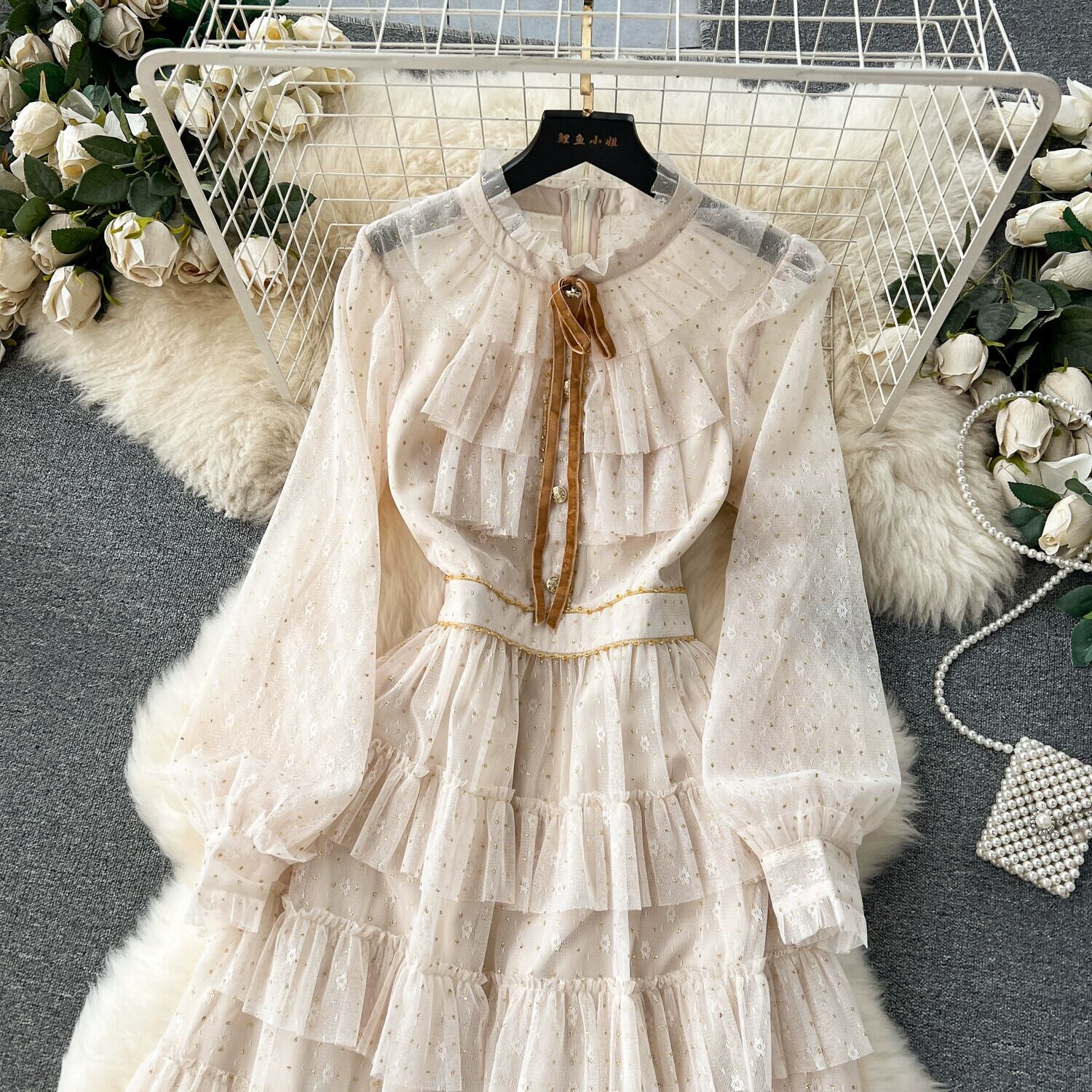 フランスの宮廷スタイルのドレス、甘いメッシュのプリンセスドレス、頑丈なプリーツフリルのミッドレングスのエレガントなドレスの女性 大人ガーリー スウィート キュート カジュアル lyxaj99658698946
