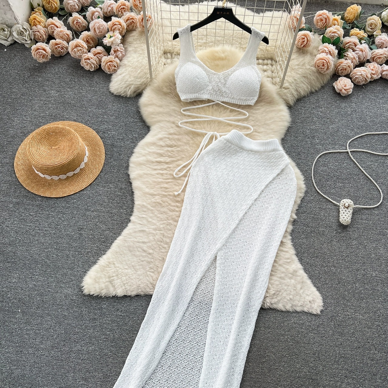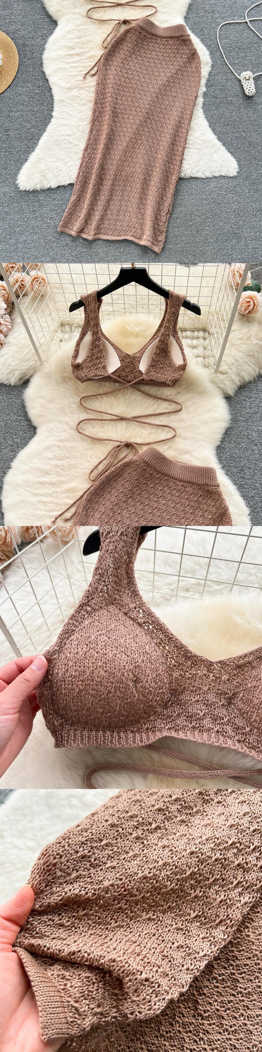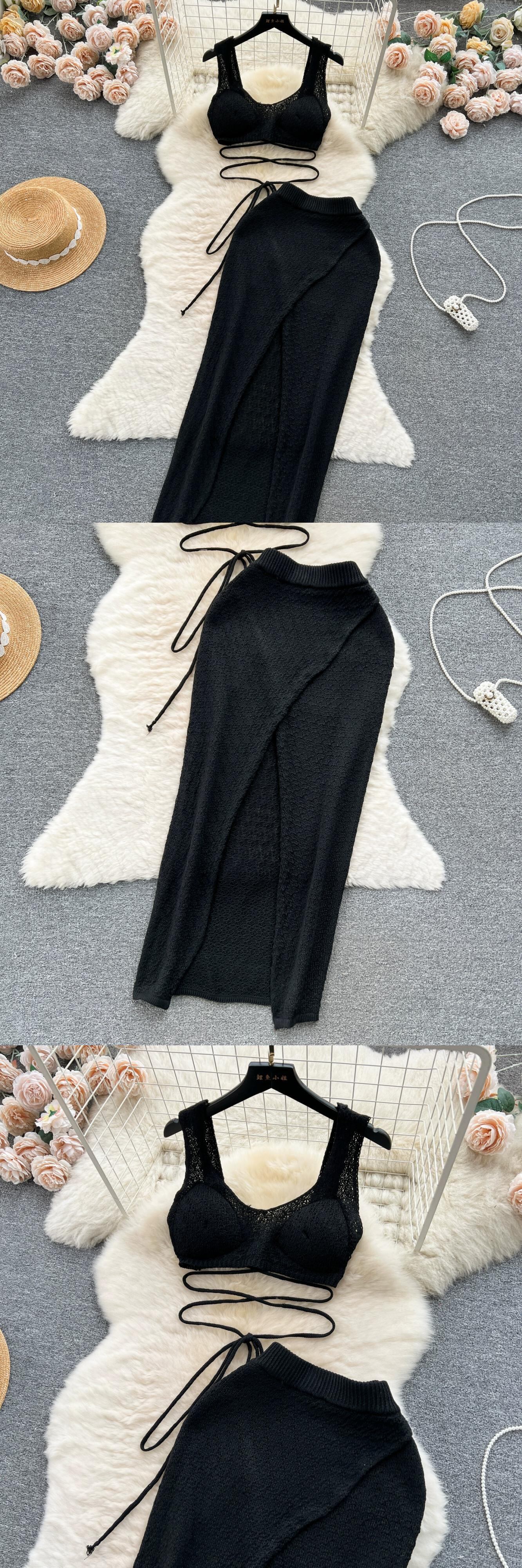 インホリデーセクシーなショートベストストラップウエストミッドレングススキーミングスリットスカートニットツーピーススーツ lyxaj83253291510