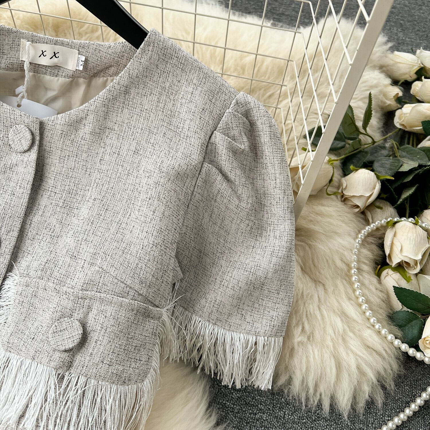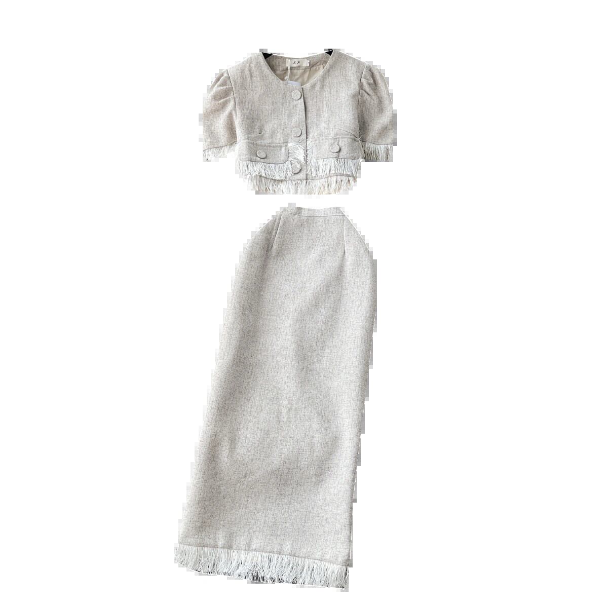 ファッショナブルなテルカーディガントップと汎用性の高いハイウエストロングスカートを備えた有能なツーピーススーツ lyxaj36424876631