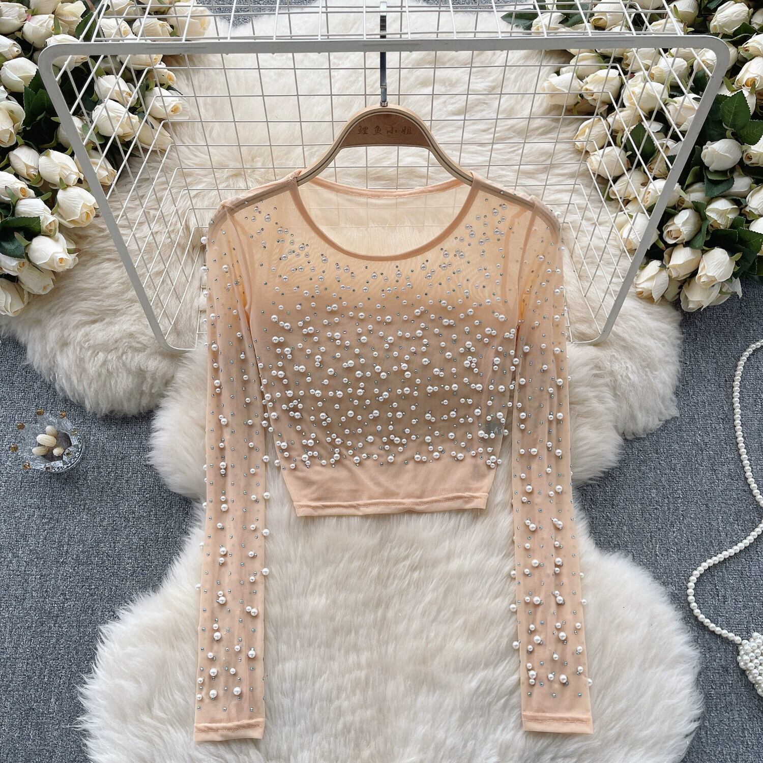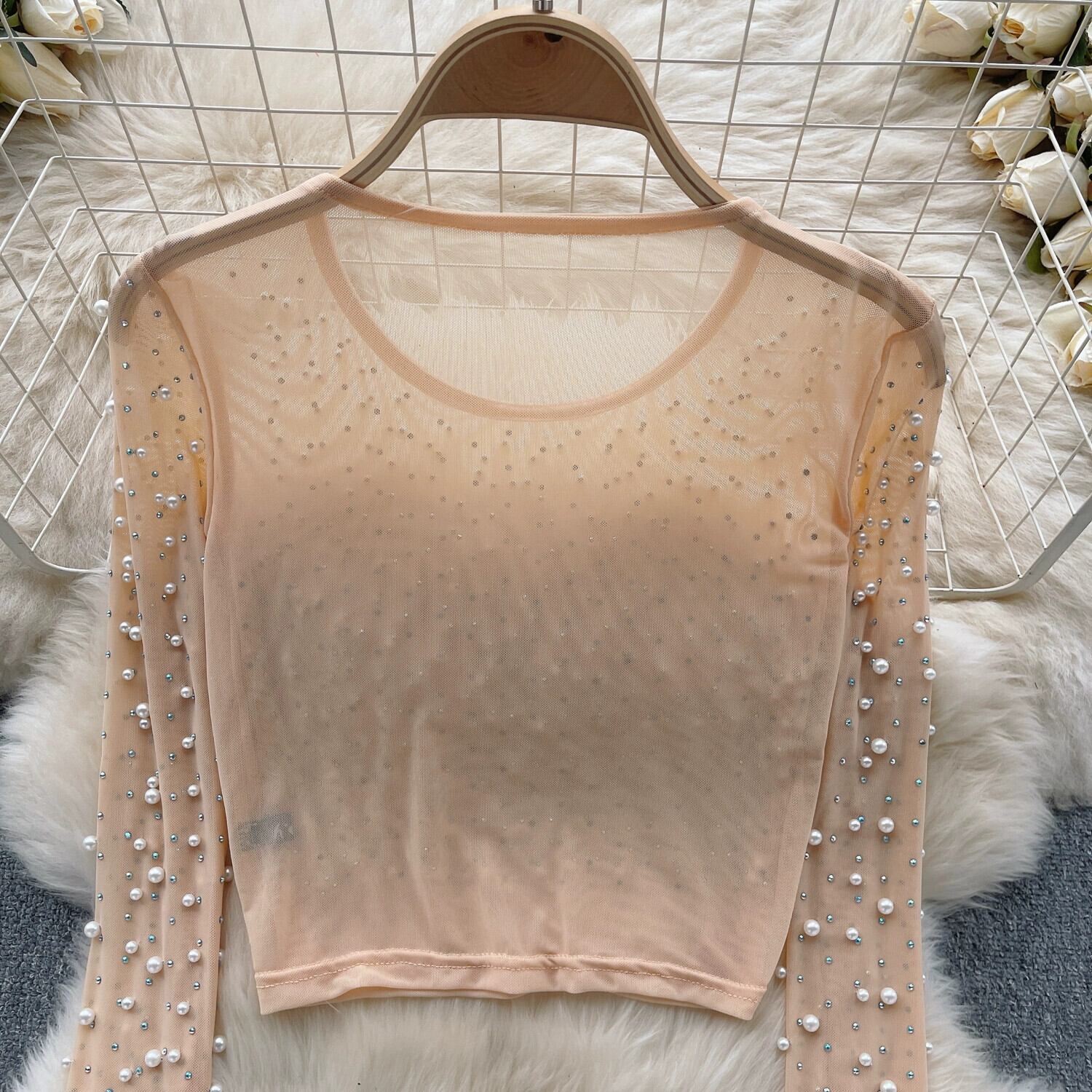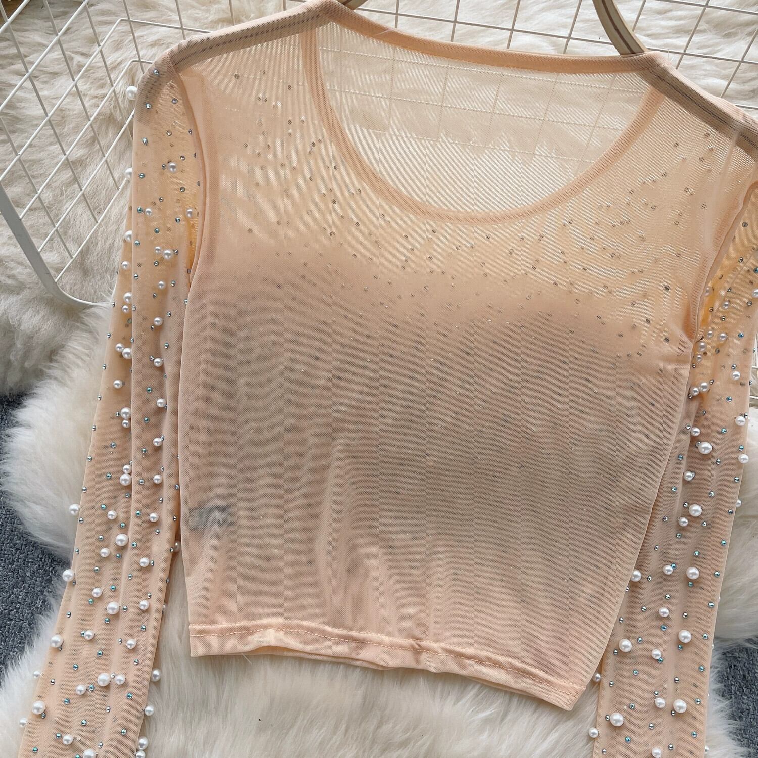 ヨーロッパとアメリカのスタイルのシースルーメッシュトップ春の女性のヘビービーズスリムフィットショートセクシーな多目的長袖Tシャツ ロング スプリング 春物 ヨーロピアン lyxaj7347103217