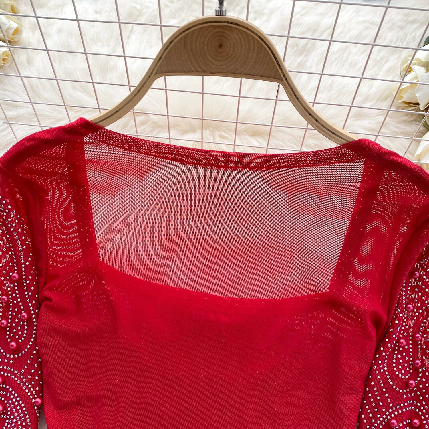 2024年初春の新作トップスレディース、重厚なデザイン、ビーズ、ドリリング、スリムフィットショートボトムシャツ、長袖Tシャツ、トレンディ ロング スプリング 春物 lyxaj80850718032