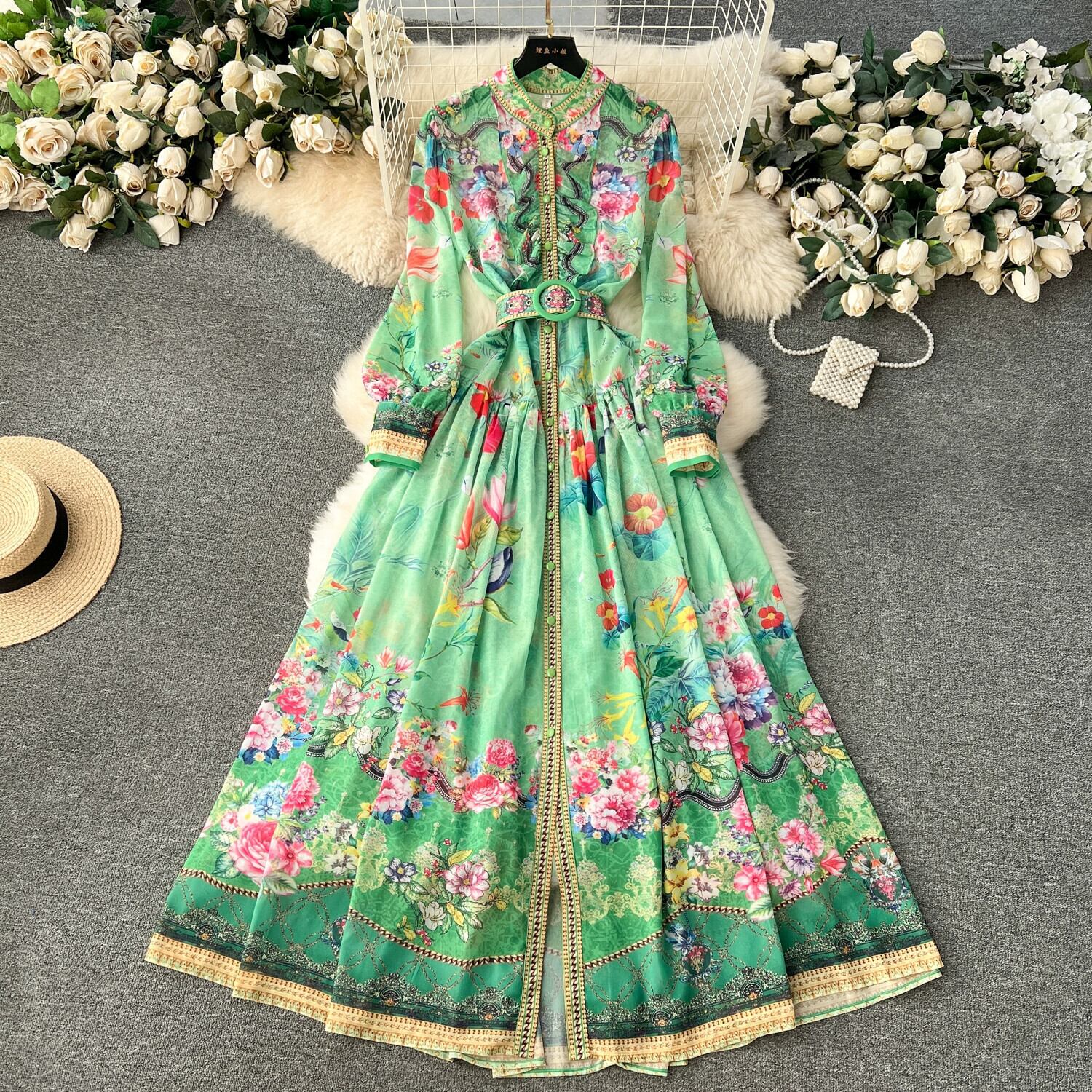 ヨーロッパの宮殿スタイルのドレス、春のドレス、フェミニンスタイル、スタンドカラー、ボタン付き、スリムロングシフォンプリントホリデードレス レース スプリング 春物 ヨーロピアン lyxaj48837986600
