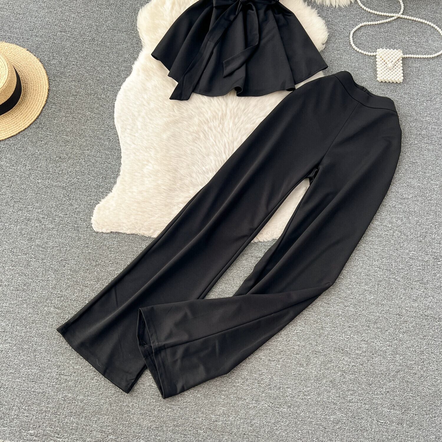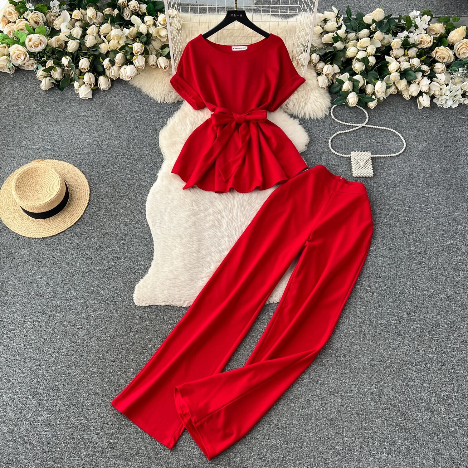 レトロファッションラウンドネック半袖レースアップウエストトップツーピースセット女性カジュアルルーズハイウエストワイドレッグパンツ Oネック lyxaj47695431419