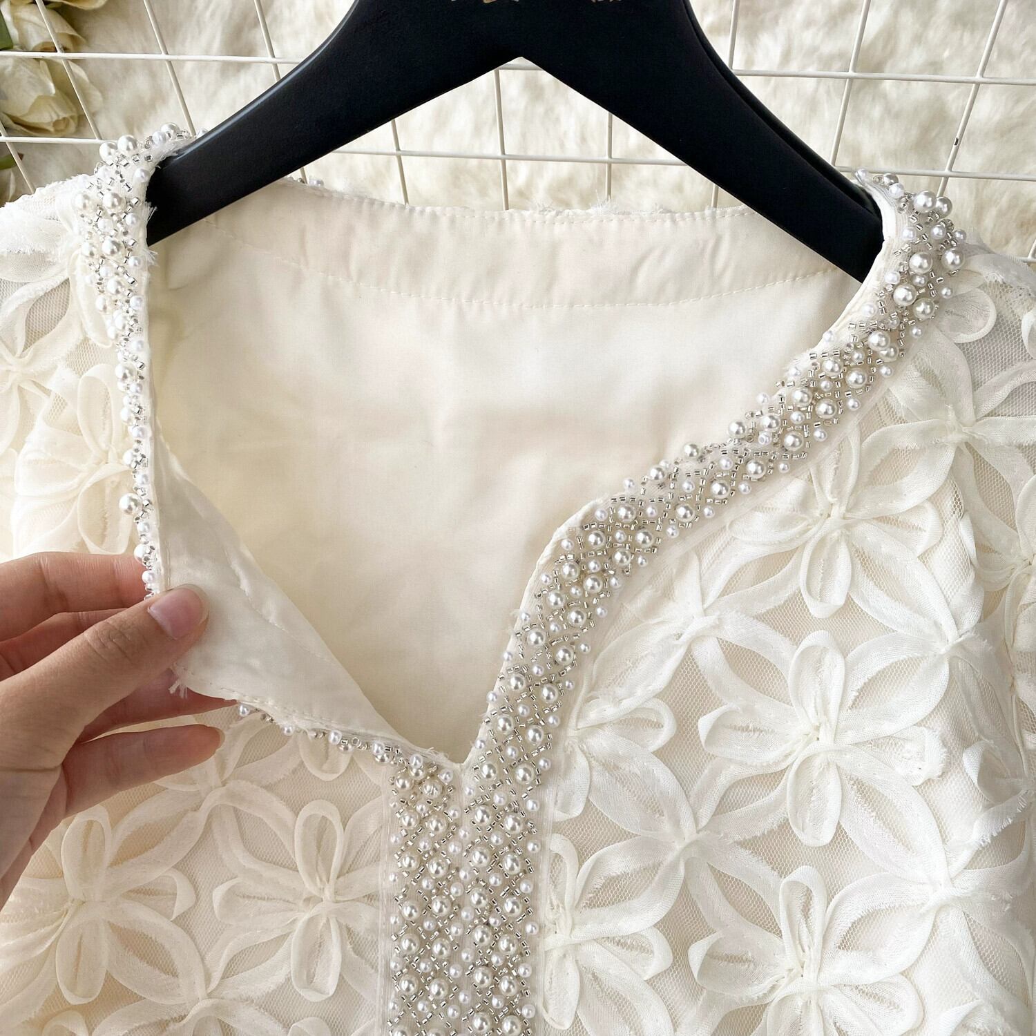 フランスのニッチ重工業ビーズレースかぎ針編み半袖ドレス女性の夏のハイウエスト痩身ファッションショートスカート サマー 夏物 lyxaj89506233228