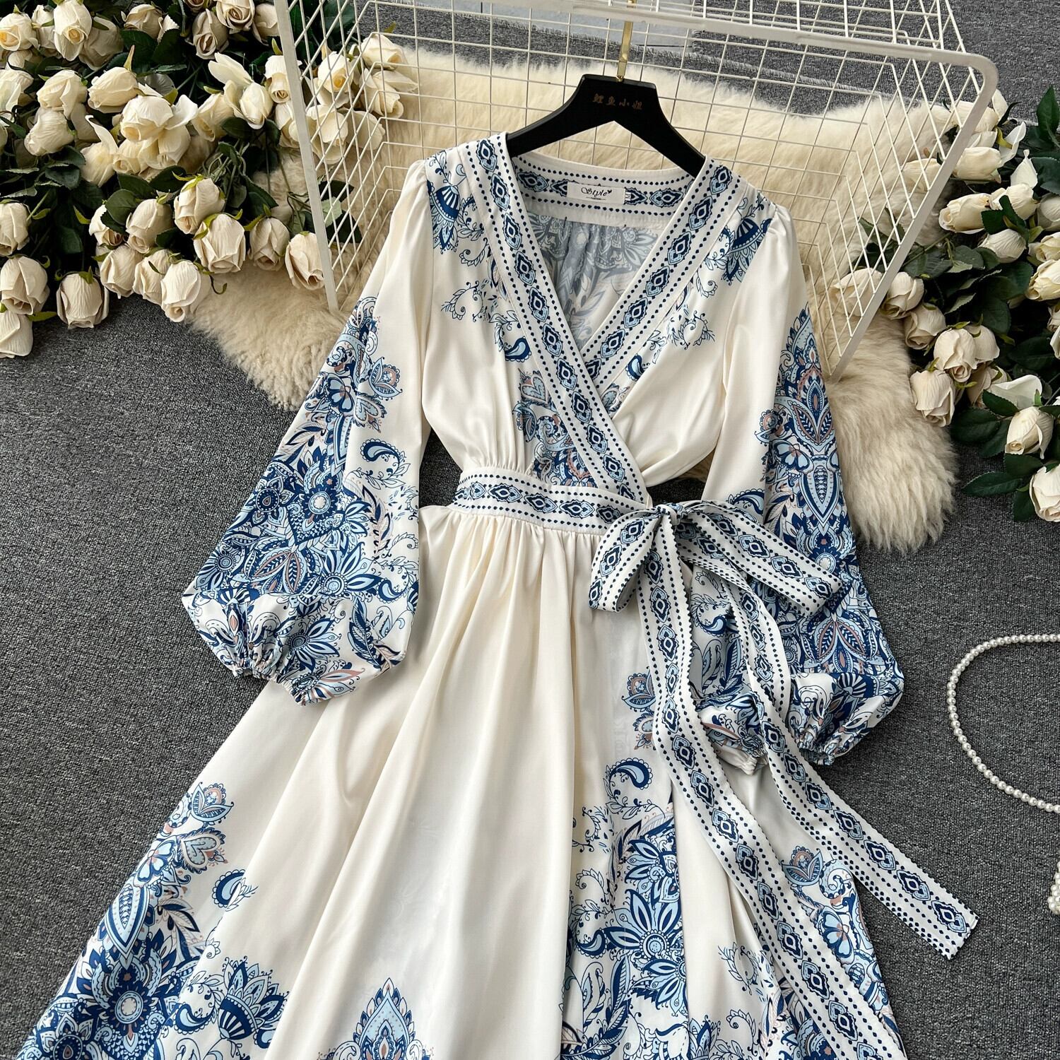 ヨーロッパとアメリカのレトロな宮殿スタイルのポジショニングプリントVネックランタン長袖レースアップウエストスタイルフレンチフルスイングドレス ロング ヨーロピアン lyxaj67904358871