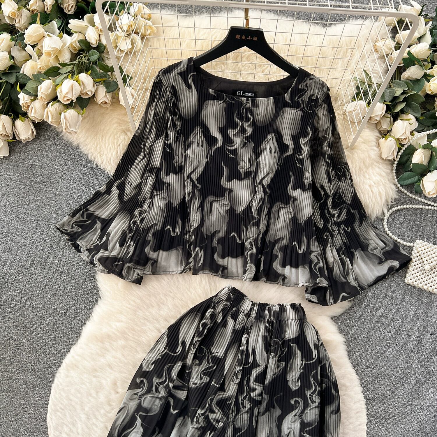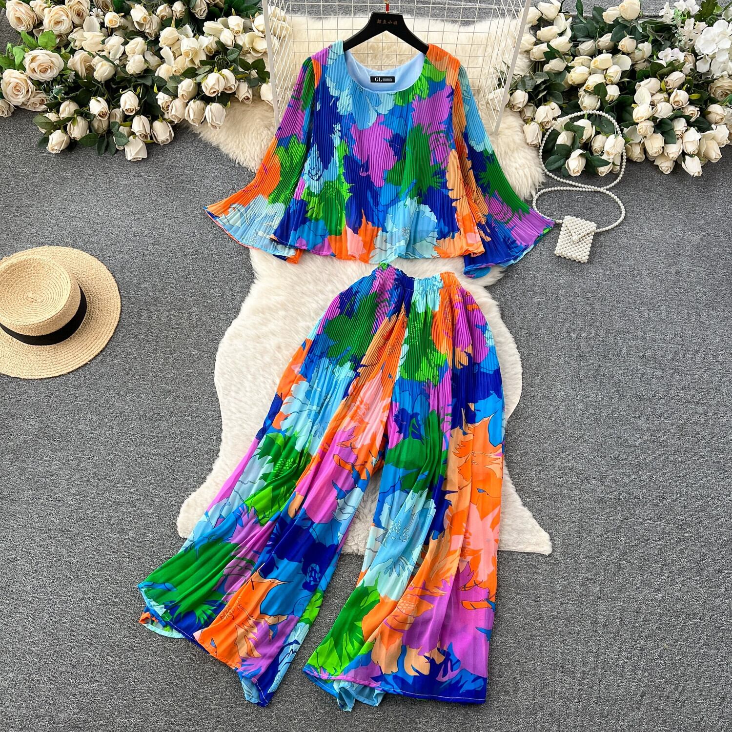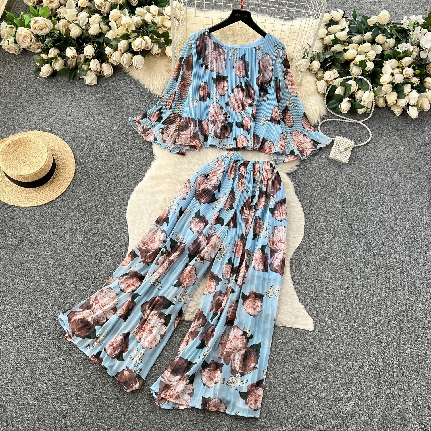 初秋コーデセット2023新作リゾート風シフォンシャツショート万能プリーツワイドパンツファッション2点セット オータム 秋物 lyxaj82240829532