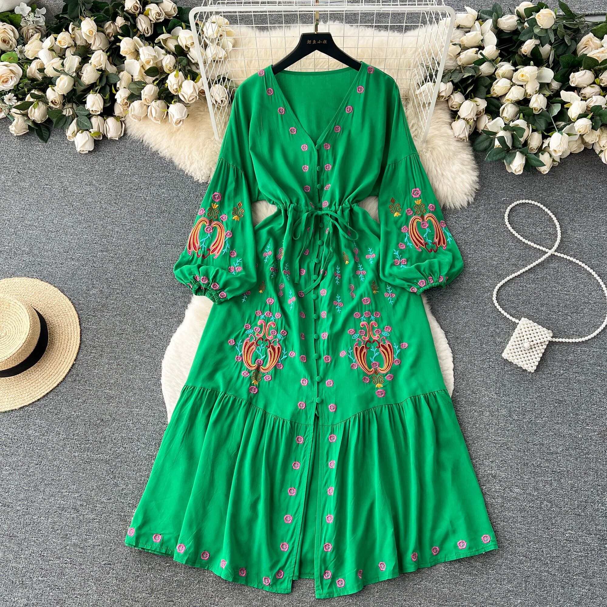 気質Vネックスリムランタンスリーブ刺繍入りシングルブレストドレス女性夏スリットと大きな裾プリントビーチスカートトレンディ レッド サマー 夏物 lyxaj4868083728