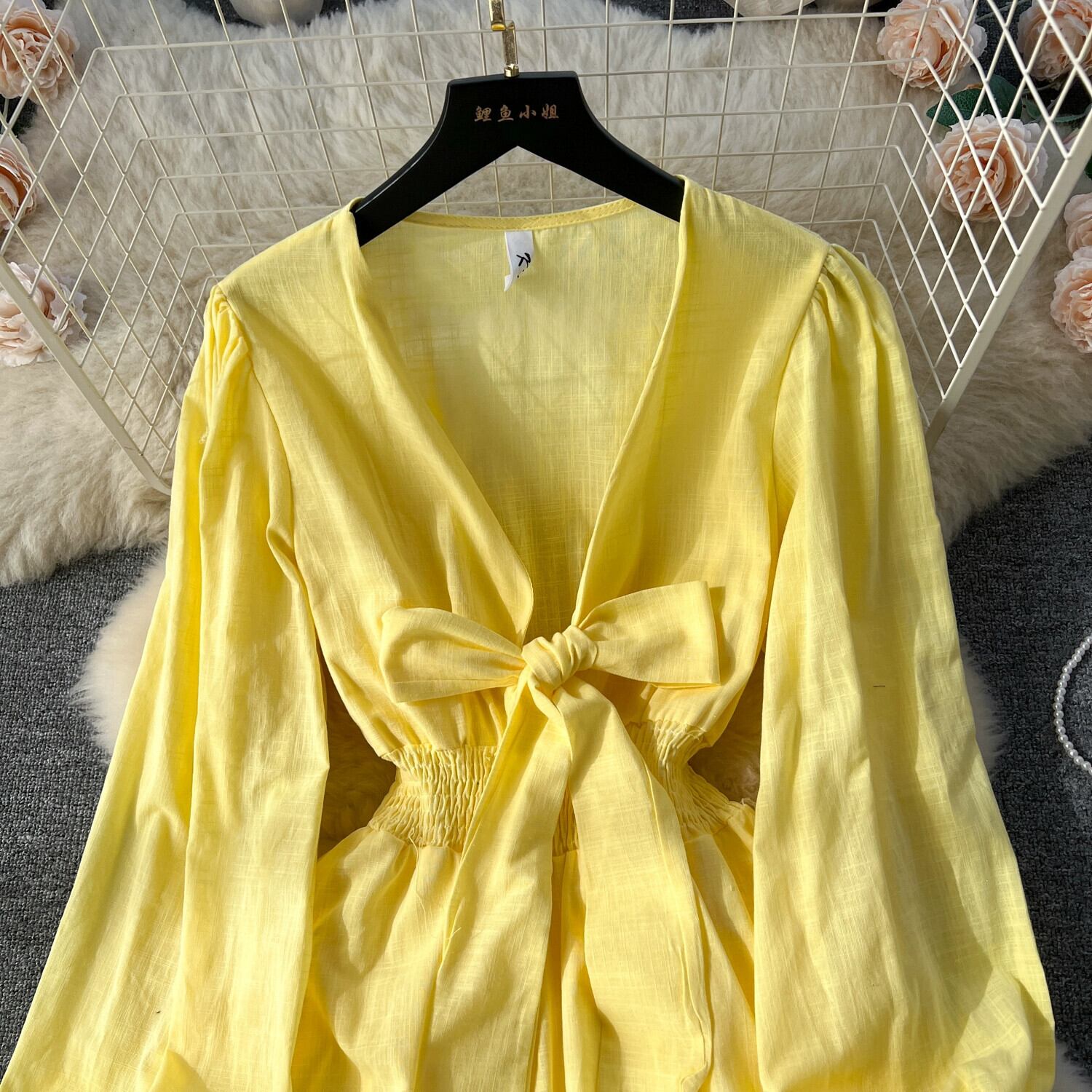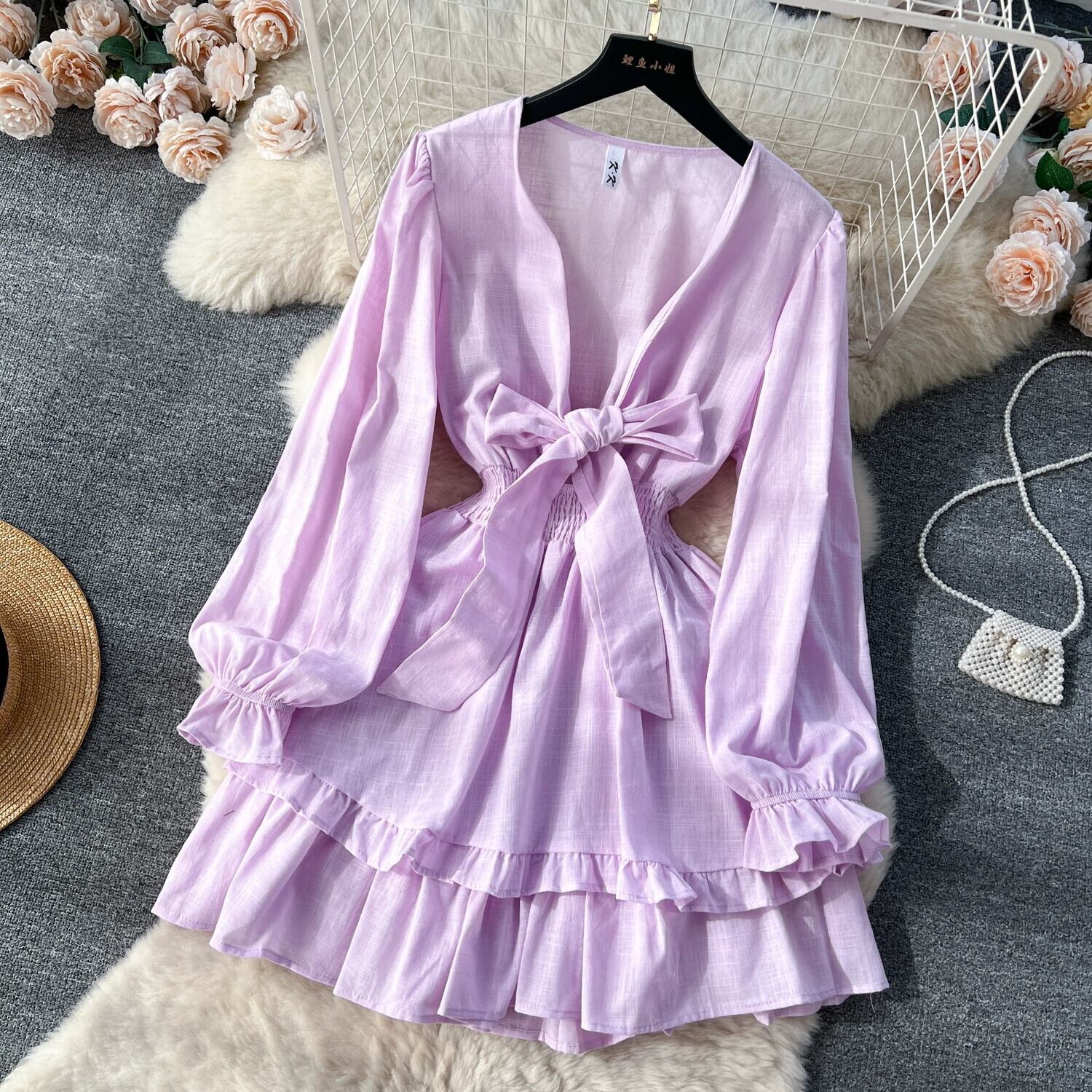 ヨーロッパとアメリカのイン衣装のドレスの女性、ニッチシック、純粋な欲望、深い V ネック、蝶ネクタイ、ウエストを締めるフリル スカート リボン Vネック ピュア ヨーロピアン lyxaj99532248058