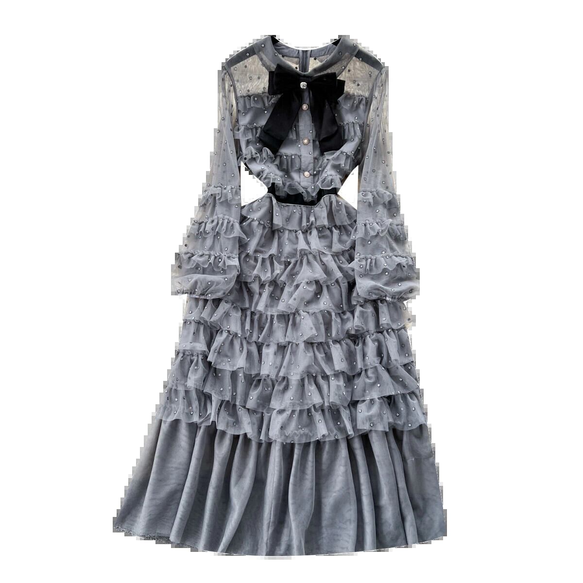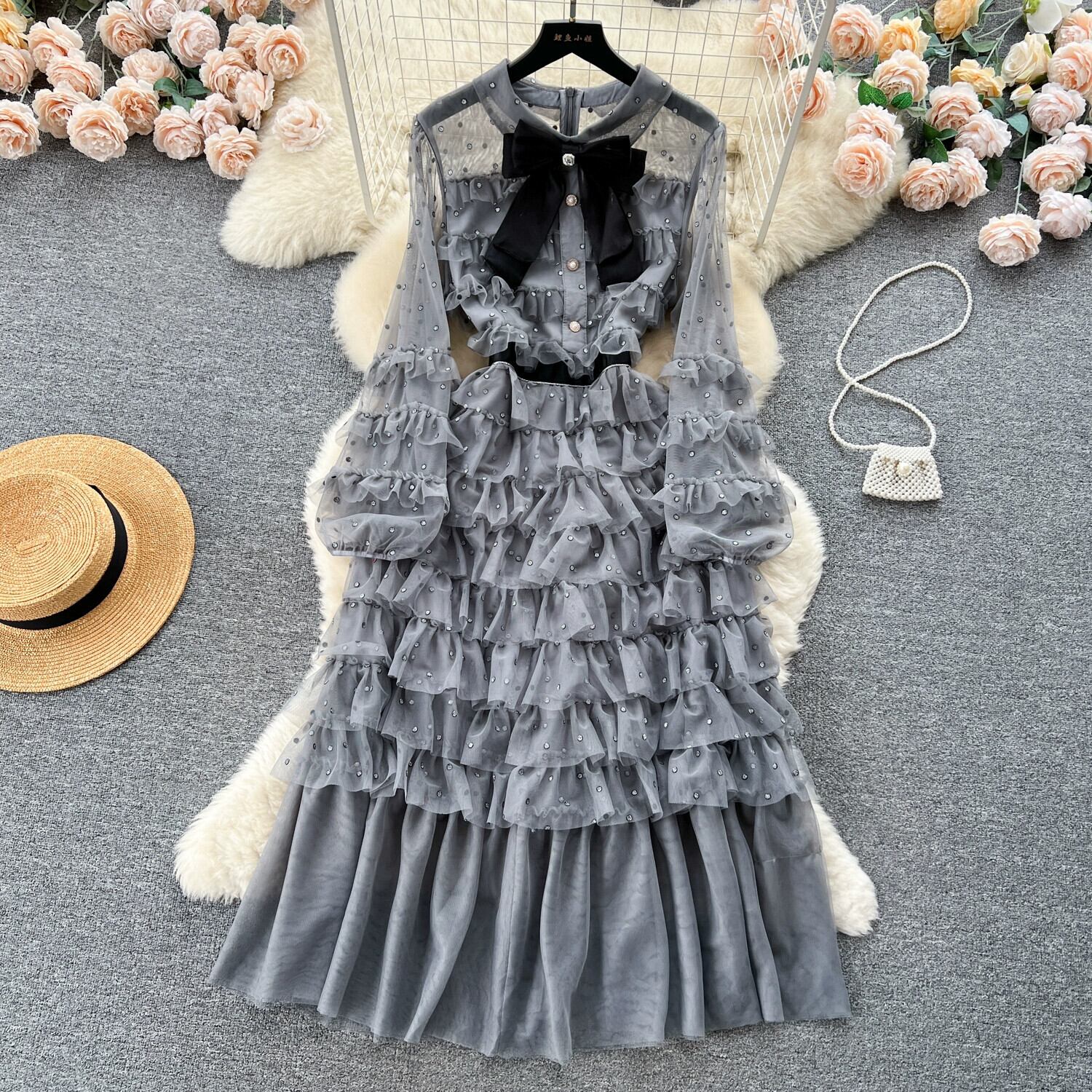 フレンチスタイルのラウンドネックリボンダイヤモンドメッシュドレス優しい気質と甘いプリンセスケーキロングドレスの女性 大人ガーリー スウィート キュート カジュアル Oネック lyxaj60795865148