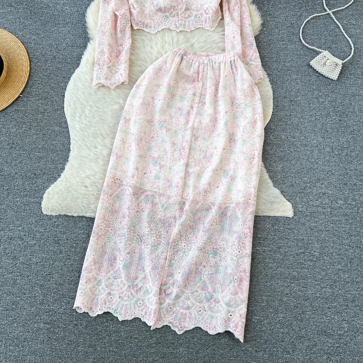 気質と年齢を軽減するショートドールカラー刺繍かぎ針編みシャツ女性フランスのハイエンドハイウエストスリムスカートスーツ レッド lyxaj69103680671
