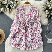 フレンチニッチデザイン V ネックレースアップウエスト不規則なドレスの女性痩身気質長袖プリントショートスカート ロング Vネック lyxaj48912730369