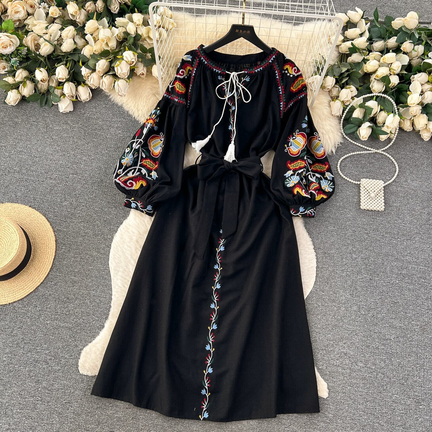 ボヘミアン ドレス レディース 秋 レトロ 重工業 刺繍入り パフスリーブ タイウエスト ミッドレングス 休暇 スカート レッド オータム 秋物 lyxaj13268856857
