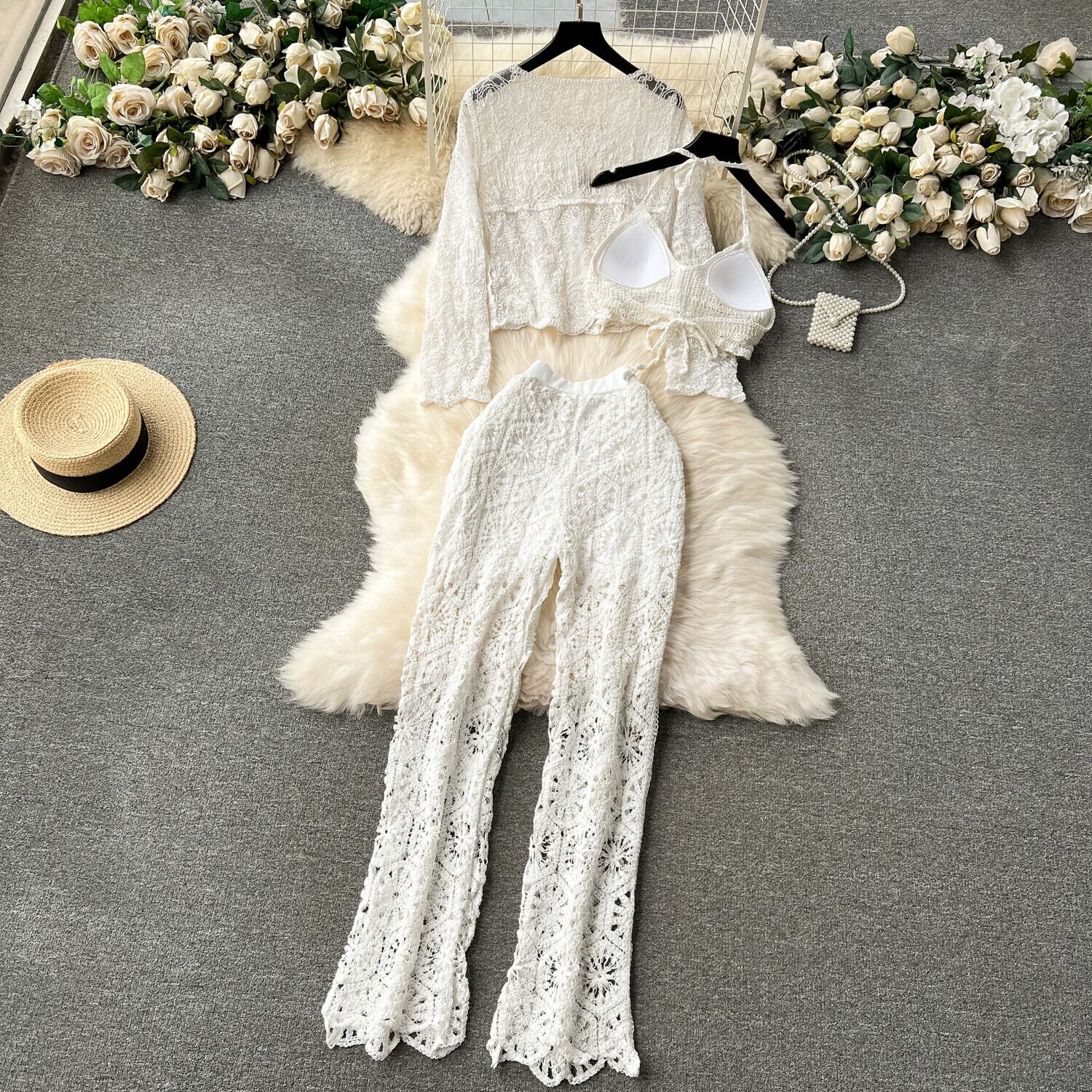 バケーションスタイルのレディーススーツ、重工業刺繍カーディガン、万能ホルターネックベスト、レトロなかぎ針編み中空ワイドレッグパンツの3点セット レッド lyxaj91651409507
