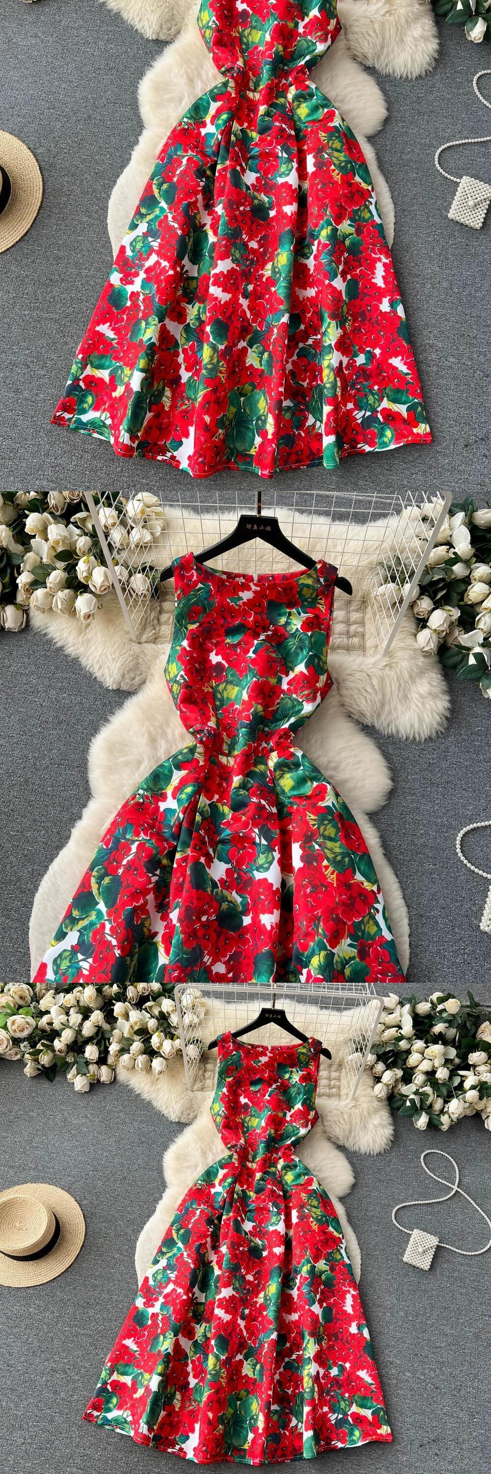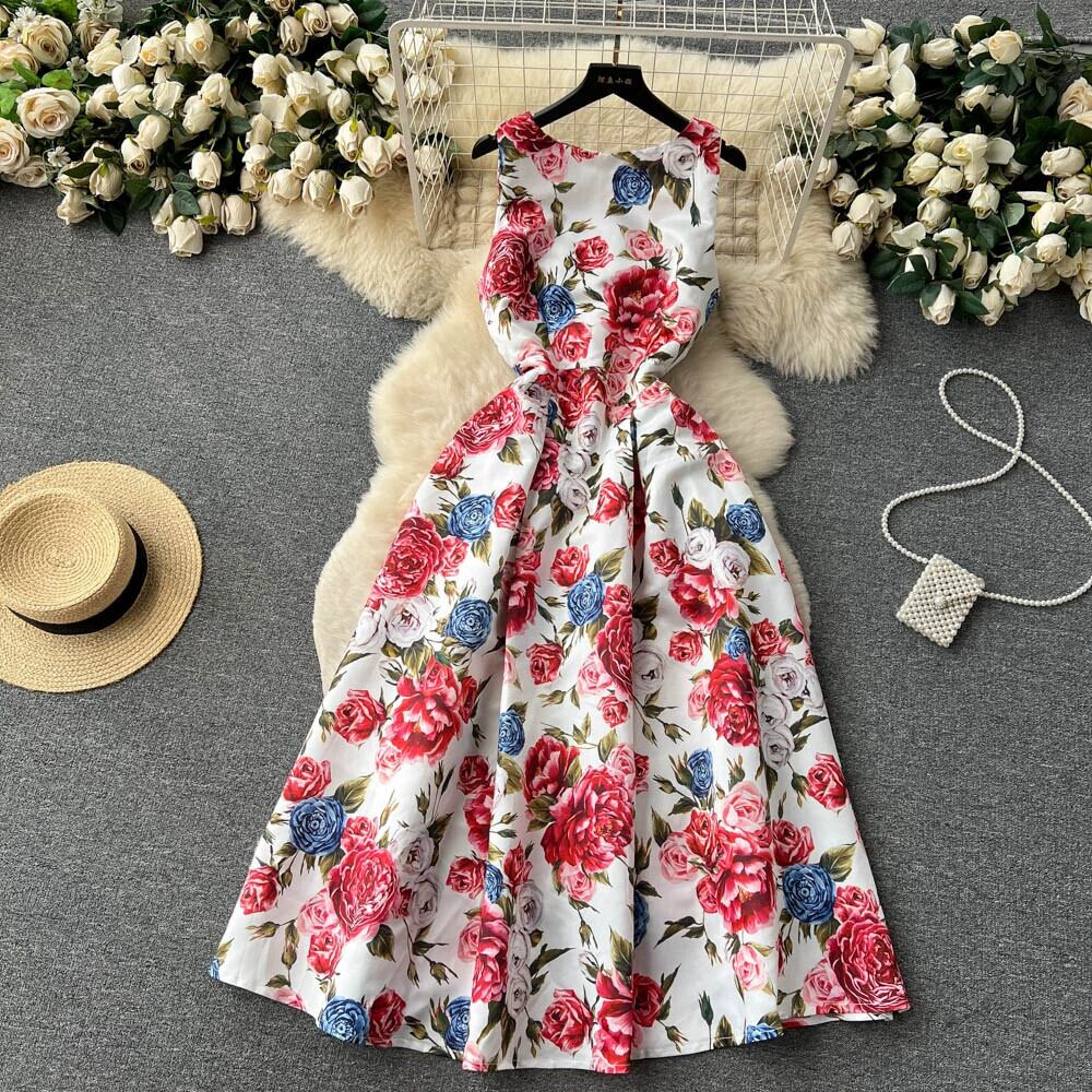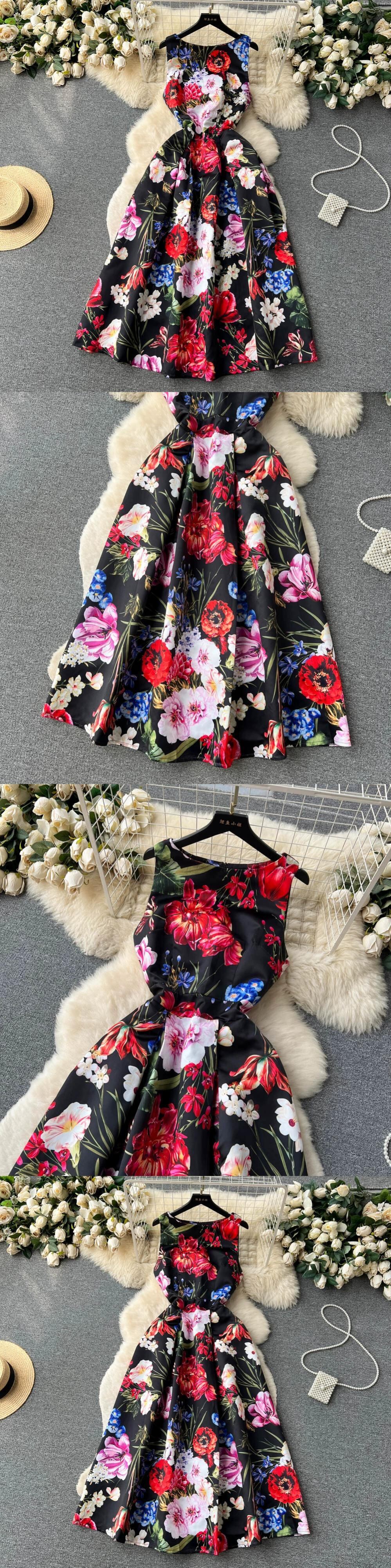 フレンチレトロハイエンドファッションプリントノースリーブベストドレス女性のラウンドネックウエスト痩身ドレスドレス Oネック lyxaj50439505084