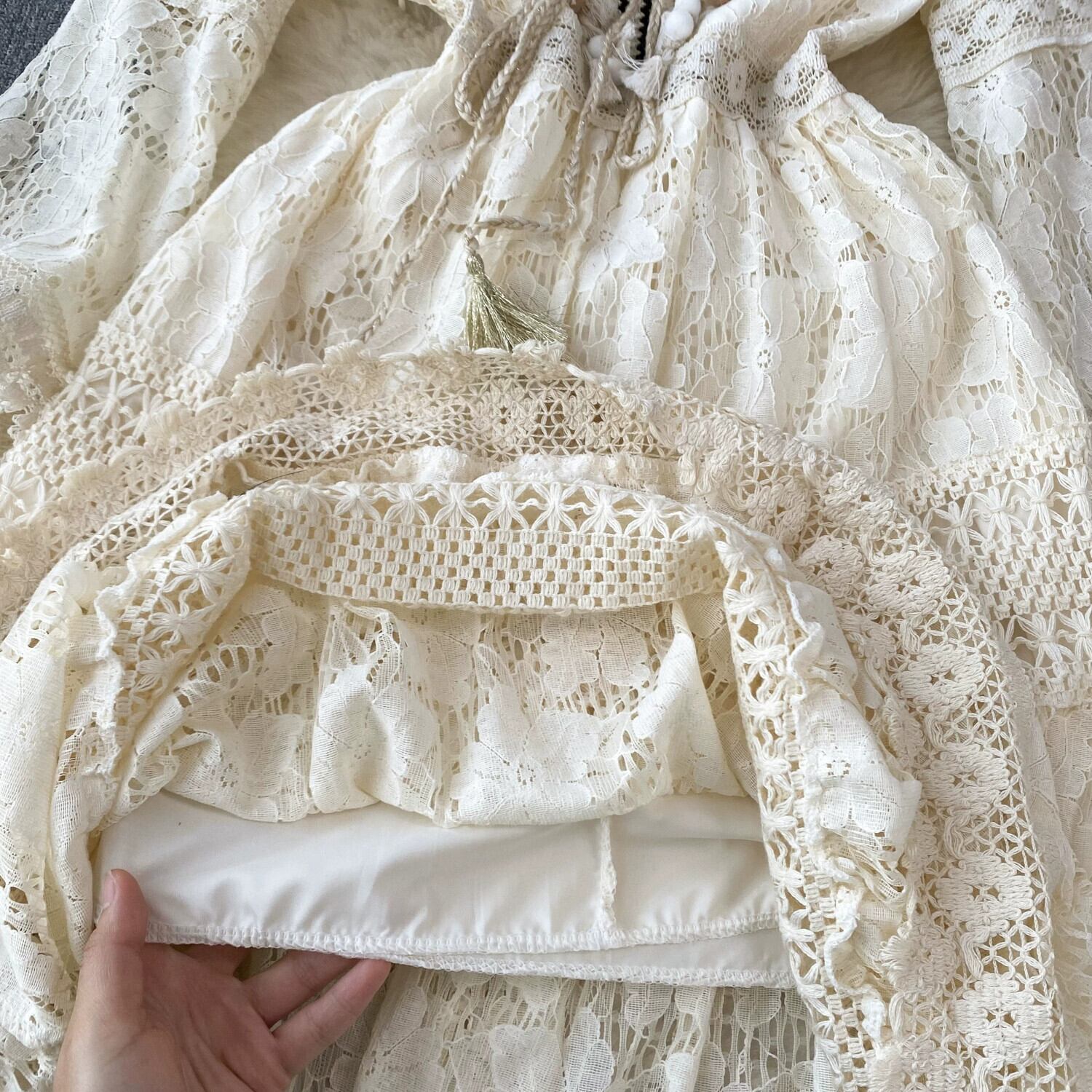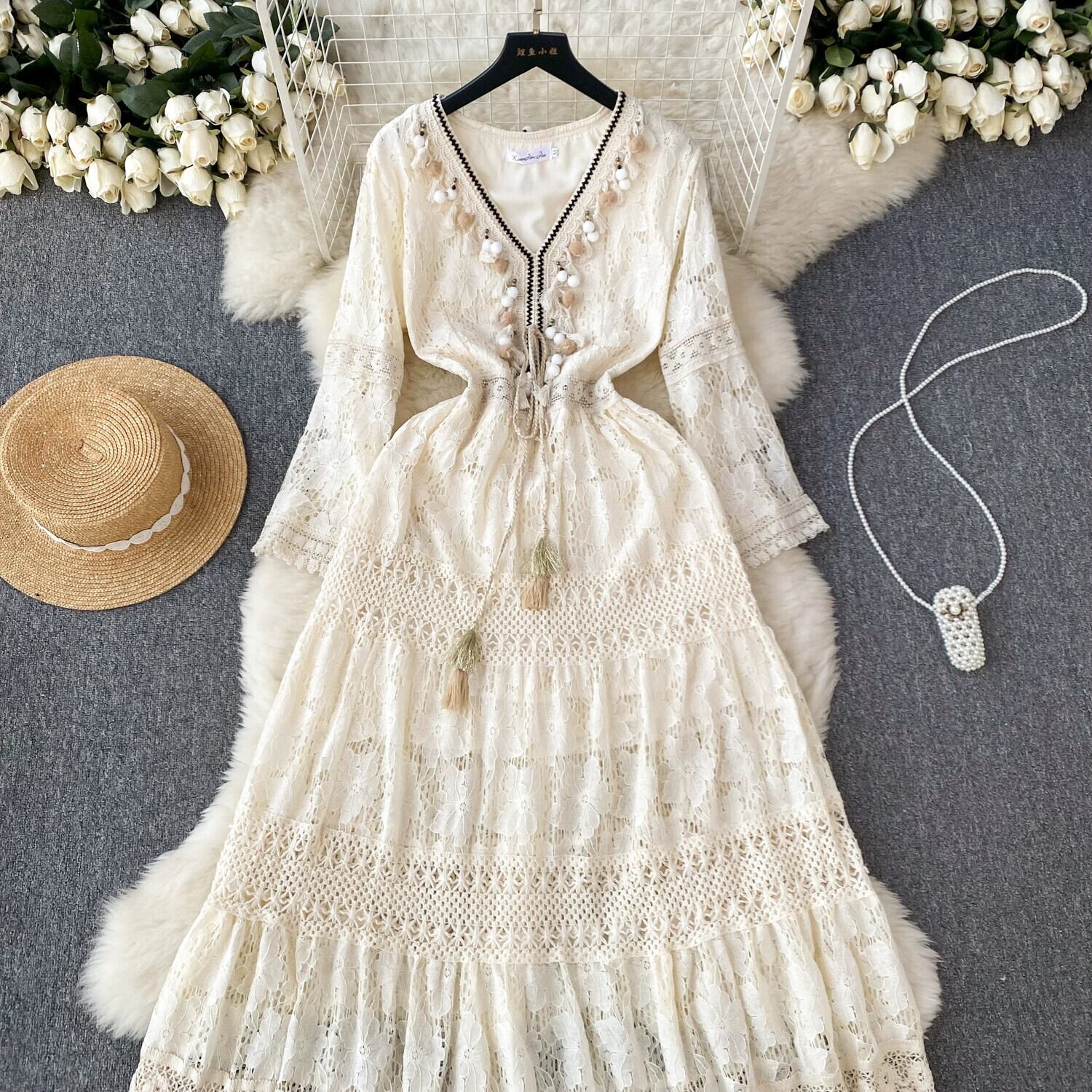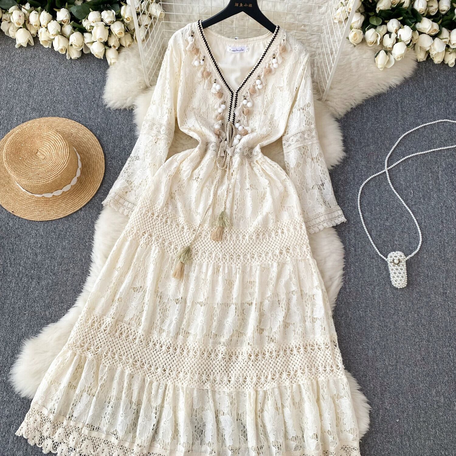 フランスの宮殿スタイルの高級ドレスの女性、メッシュかぎ針編み V ネックテルデザインニッチ スーパー フェアリー ロング スカート レース Vネック lyxaj97171331599