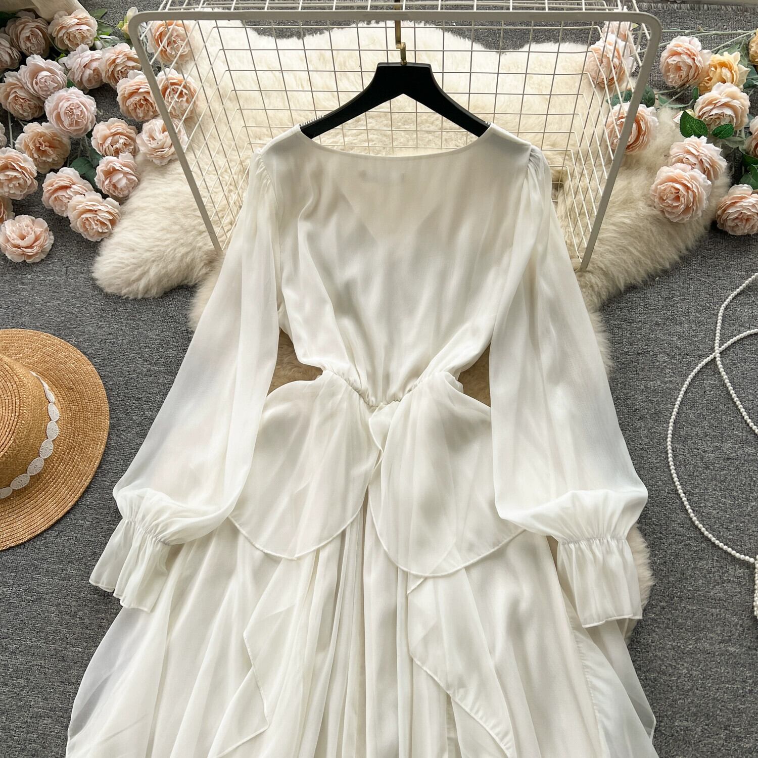 フランスの優しいスタイルのドレスの女性 2024 春の新しいスタイルの気質 V ネックスリムミッドレングスフリルシフォンスカート スプリング 春物 Vネック lyxaj9727857568