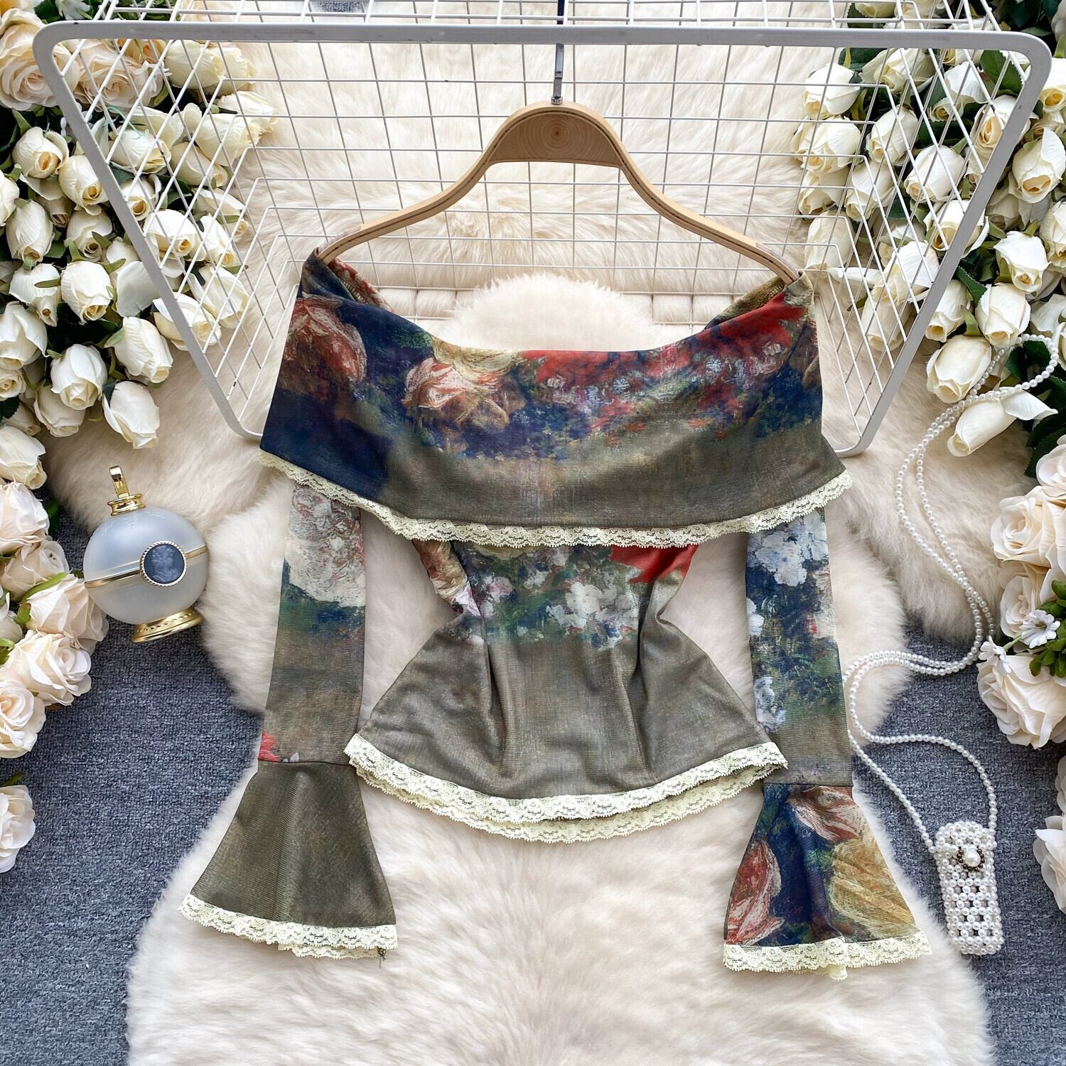 スタイリッシュなワンラインネックラインオフショルダー長袖ツイストスリムフィットショートレトロプリントレーストップスを着たいという純粋な欲求 ロング lyxaj58202438378