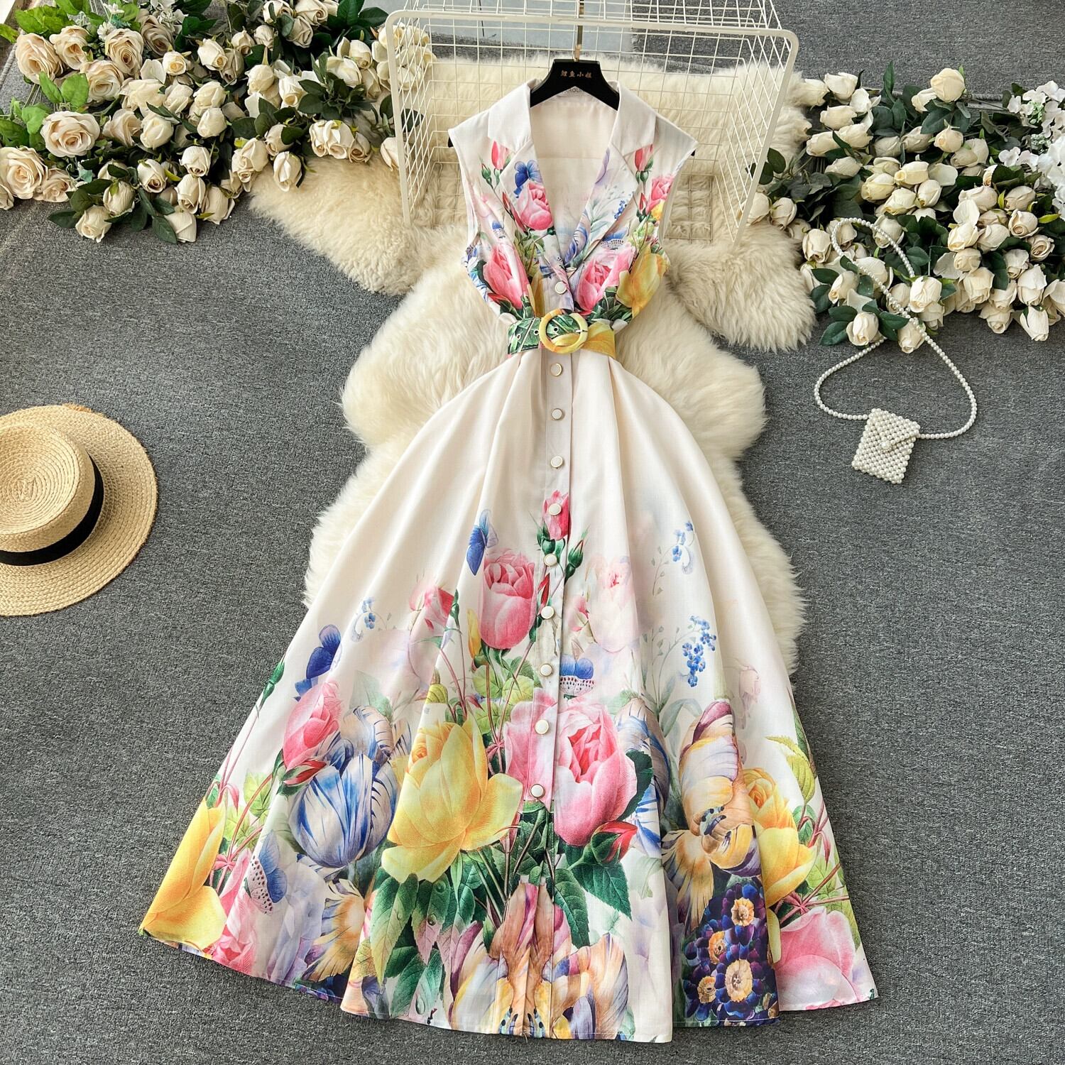 ブロッサムシリーズデザインセンスの衿・ボタンダウン・ウエスト付きプリントスーツ、スリムで高級感のあるロングノースリーブワンピース 長袖 lyxaj97005654029