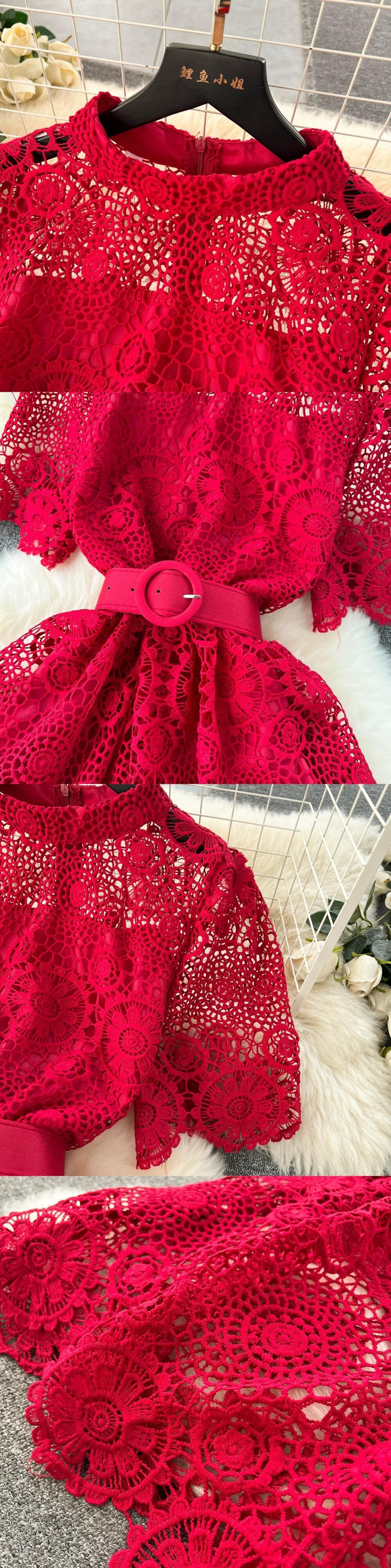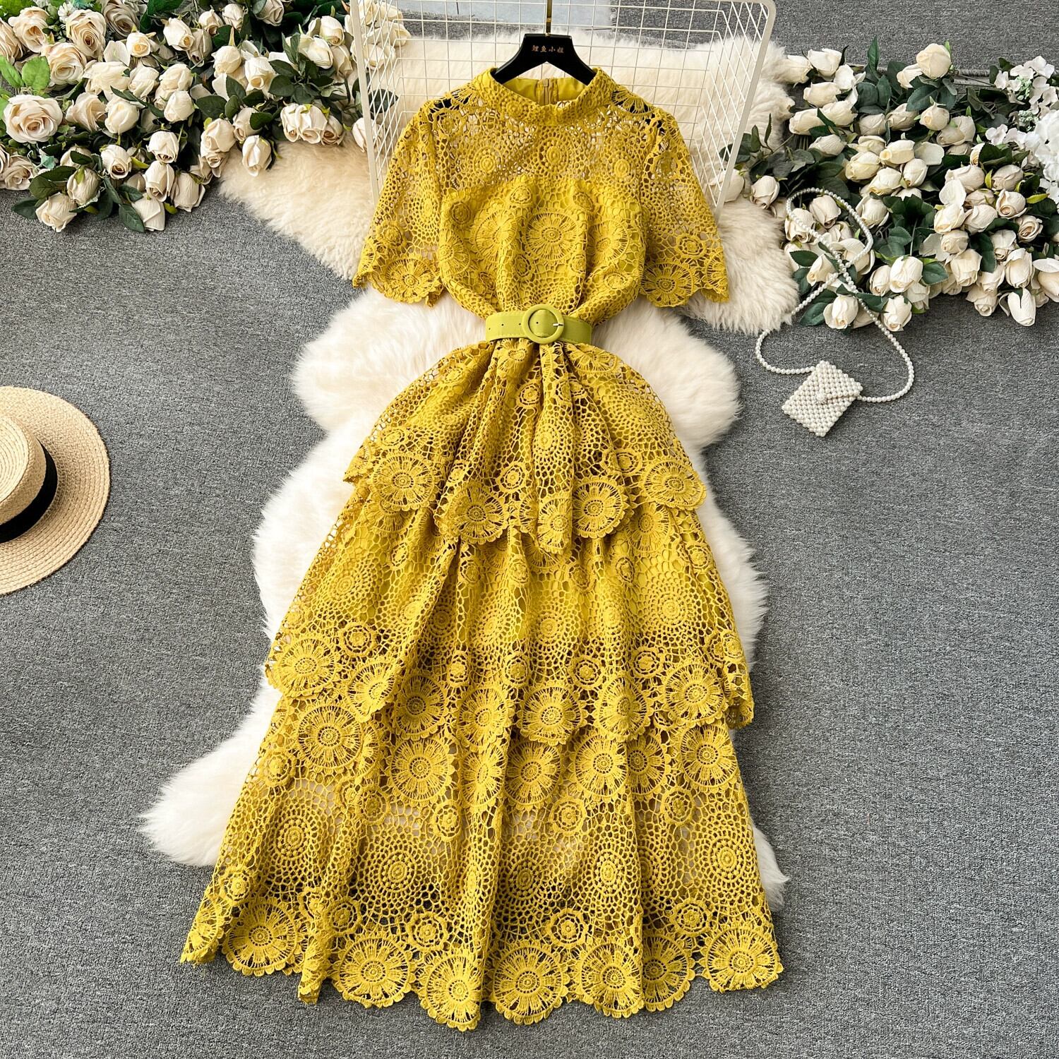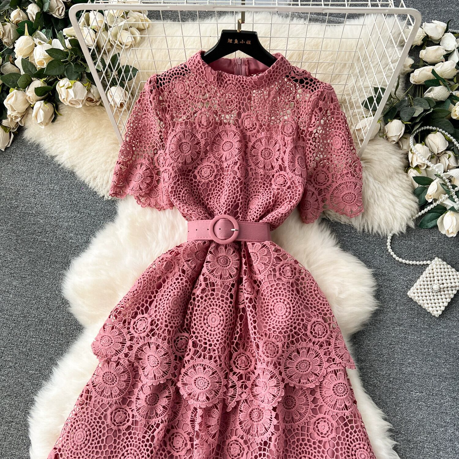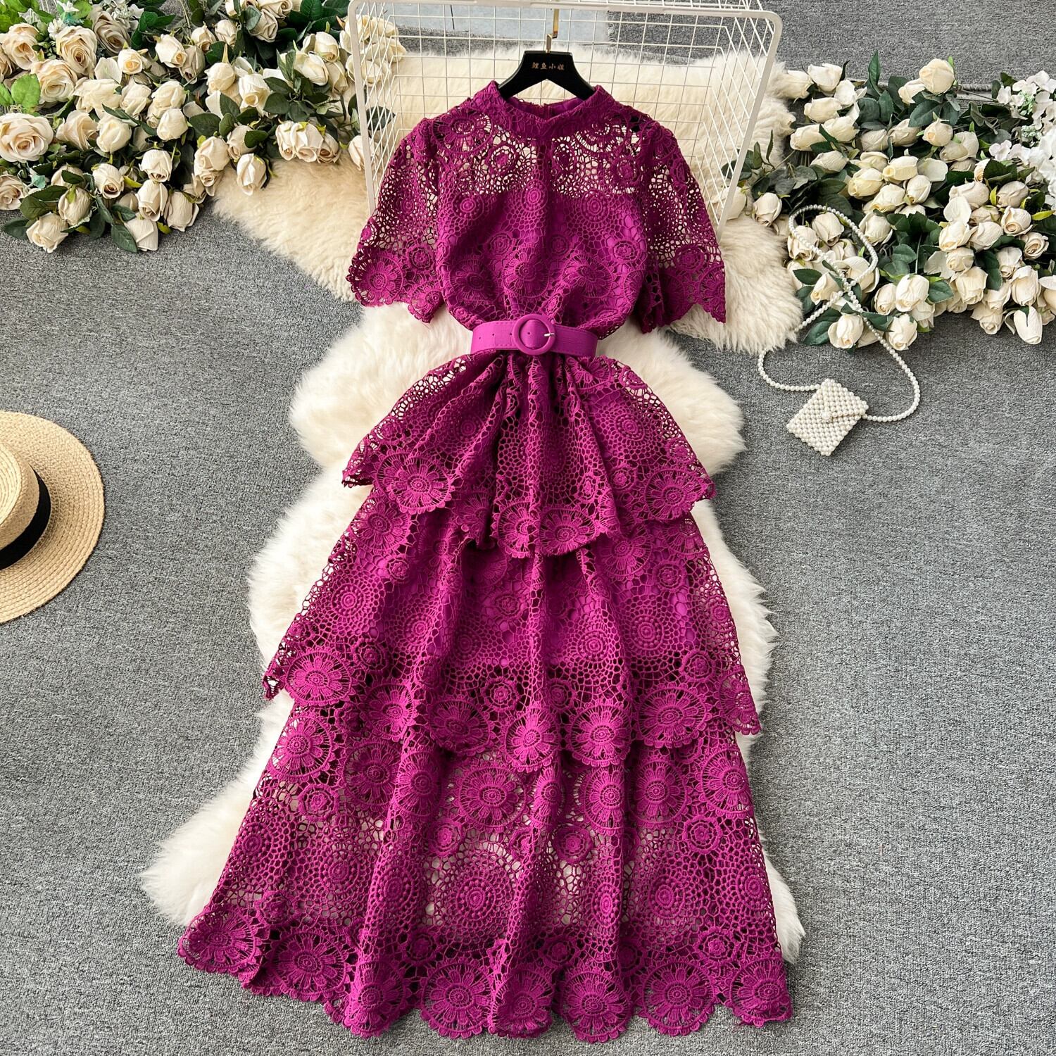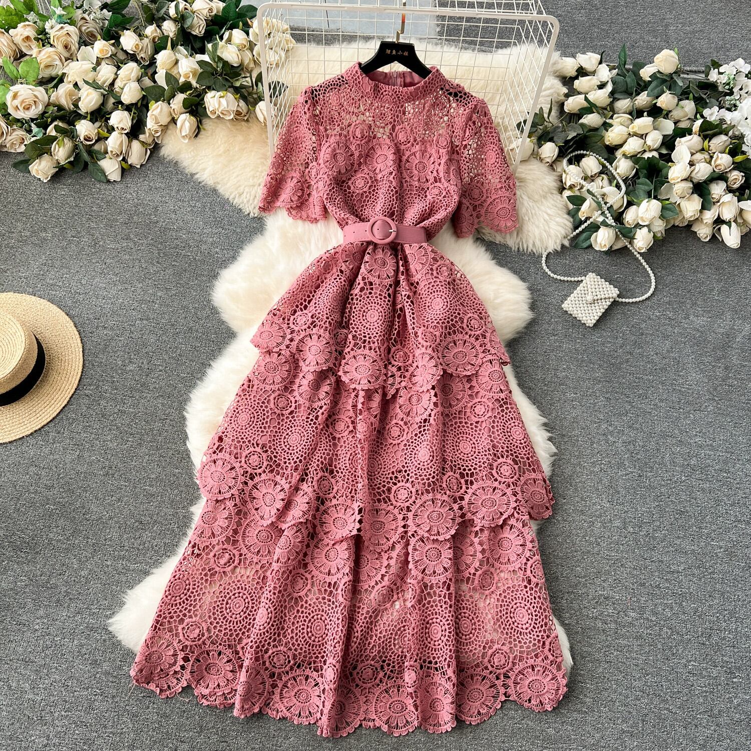 ライト高級重工業中空彫刻レースドレス女性のハイエンド多層フリルケーキスカートレディスタイルドレス レッド lyxaj87567458175