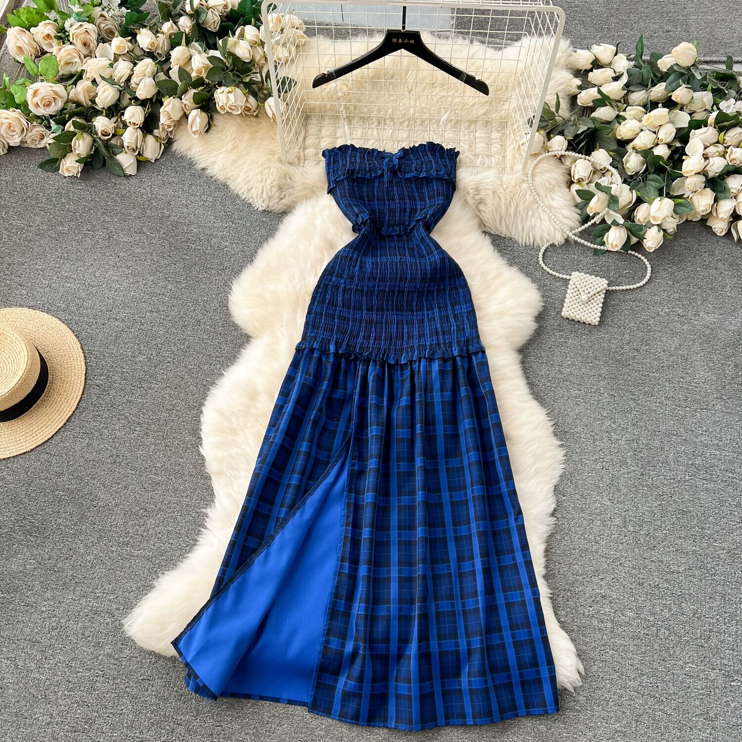セクシーなチューブトップチェック柄スカート甘い菌エッジ弾性スリムロング策略スリットドレス気質ドレス女性 エラスティック 伸縮 大人ガーリー スウィート キュート カジュアル lyxaj61293498208