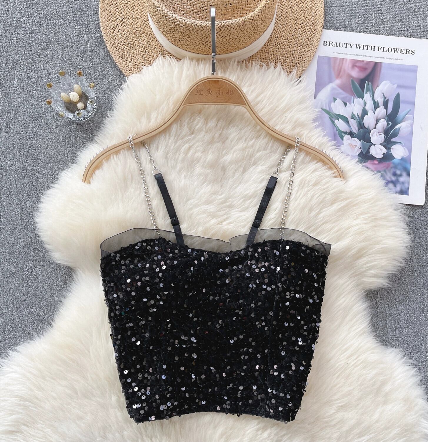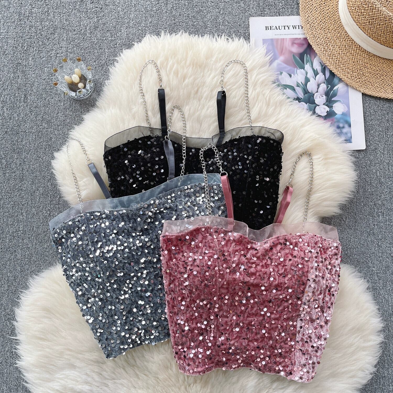 ホットスタイルチェーンキャミソール2024早春の新スタイルライトラグジュアリースパンコールベルベットショートクロップトップ スプリング 春物 lyxaj79089564137