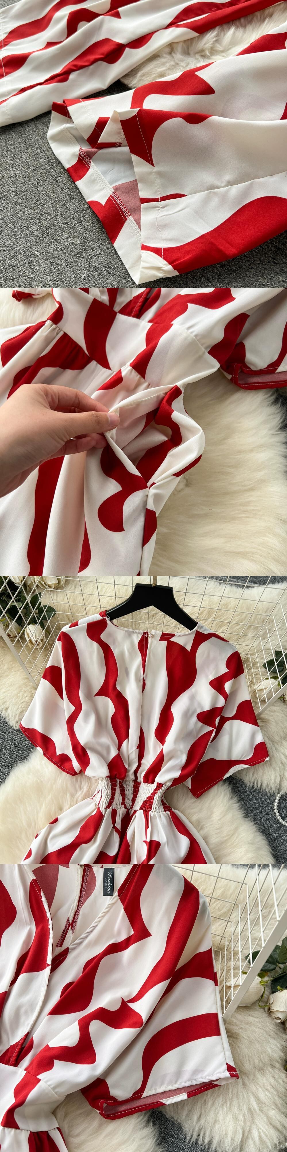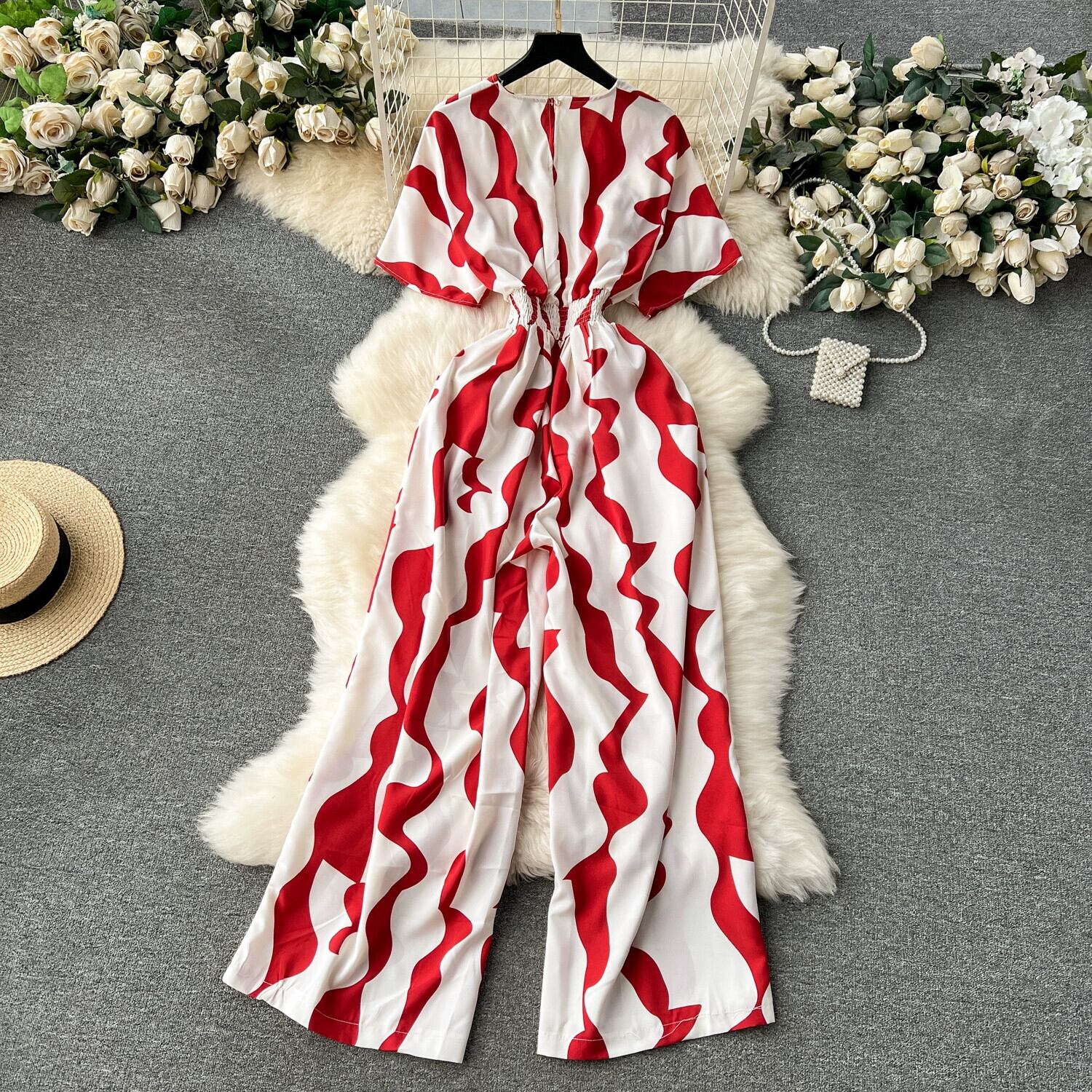 ヨーロッパとアメリカのリゾートスタイルのジャンプスーツ、フェミニンなVネックウエスト、着痩せロングデザイン、プリントストレートワイドレッグパンツ ヨーロピアン lyxaj12837397454
