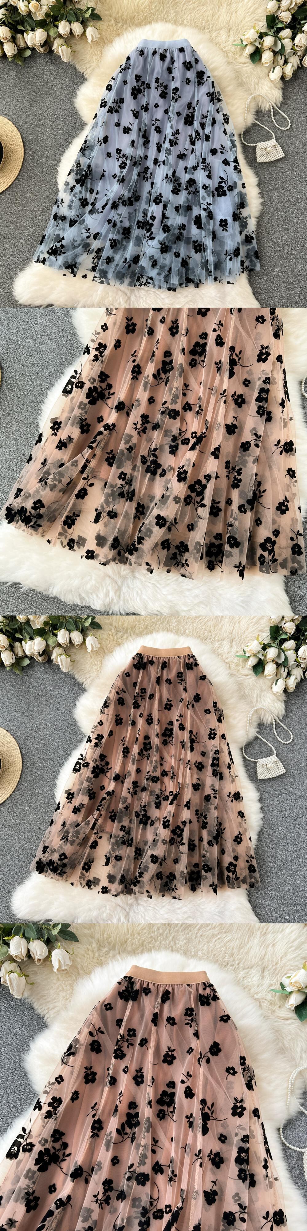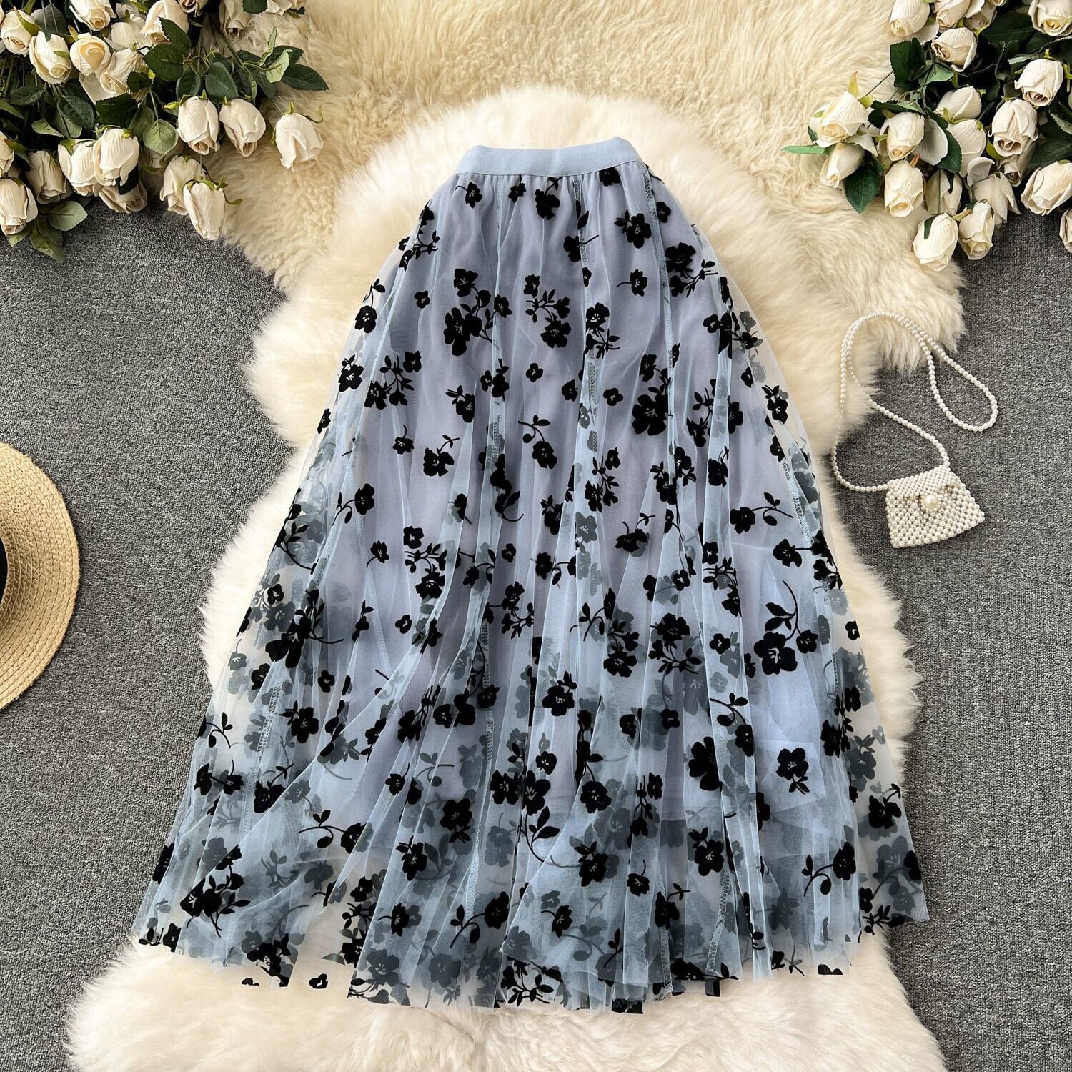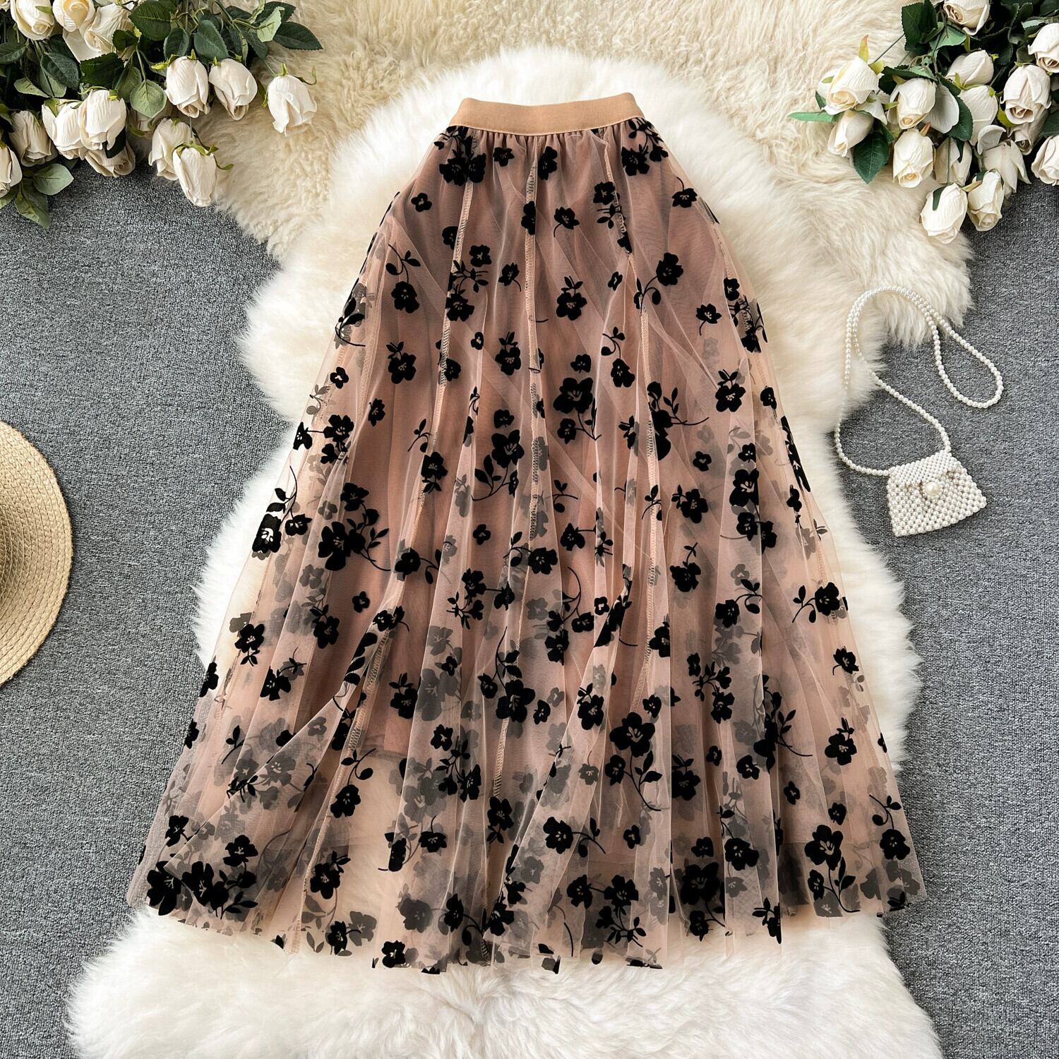 フレンチレトロメッシュスカート女性 2024 新しいハイウエストミッドレングス A ラインスカート植毛愛パフスカート Aライン lyxaj56247152910