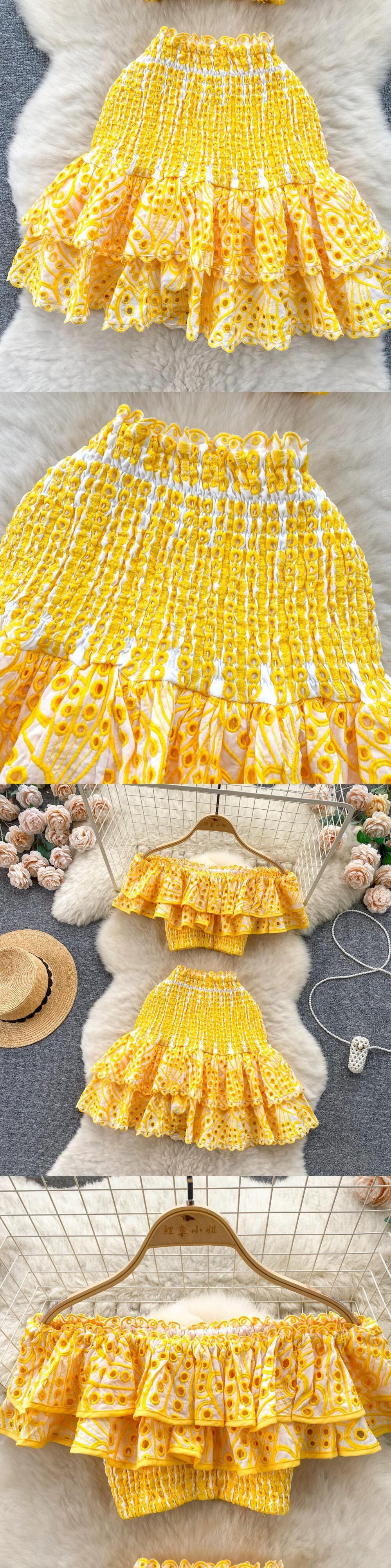 セレブリゾートスタイルスーツレディース、重工業刺繍、中空フリルワンショルダートップ、ショートスカート、2点セット lyxaj2436438861