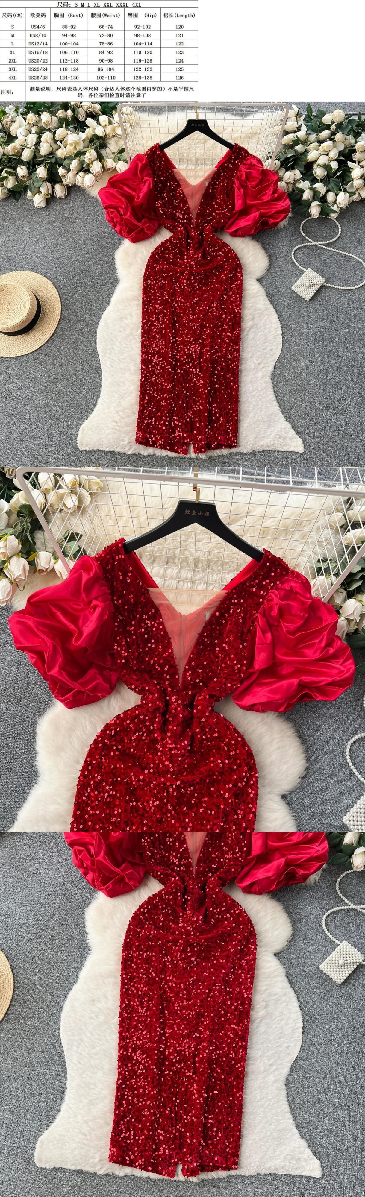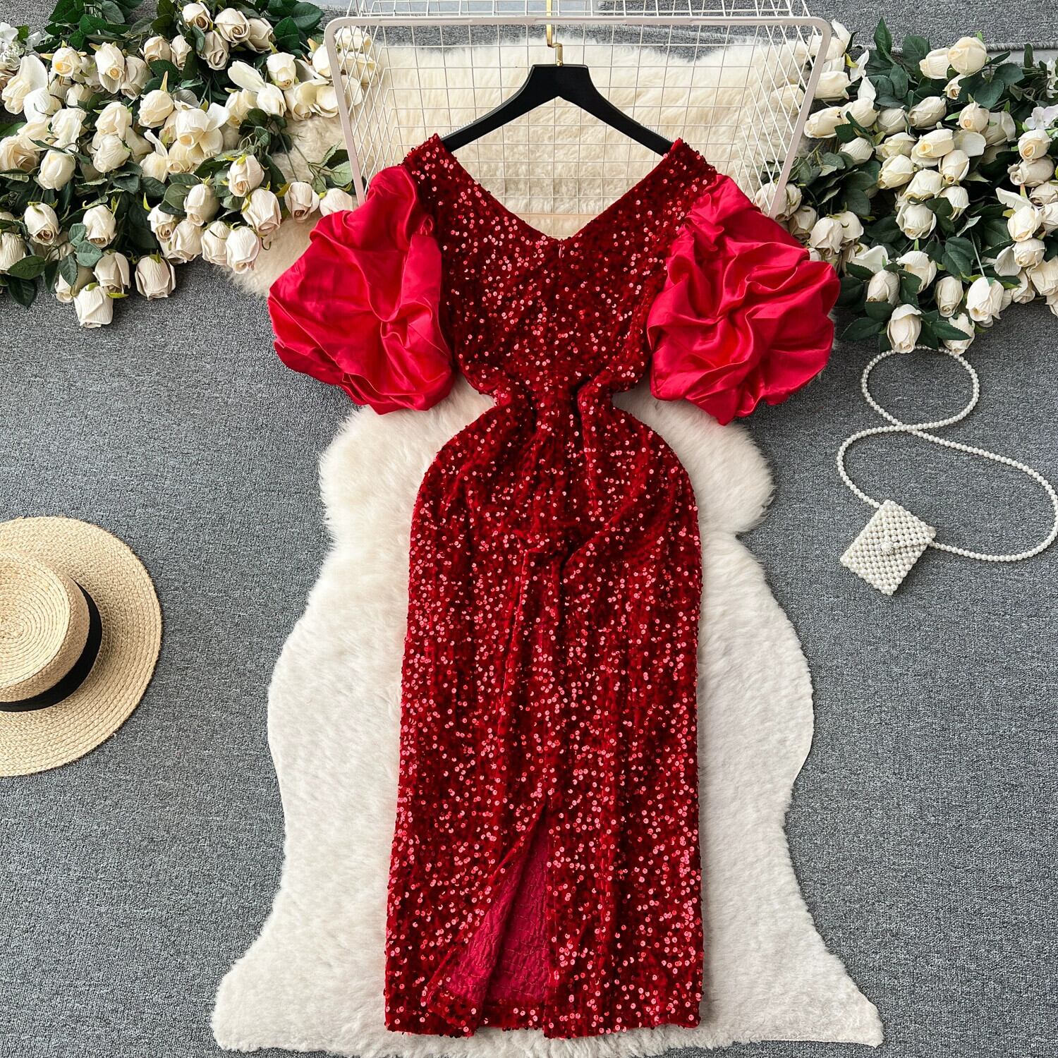 フレンチライトラグジュアリーハイエンドシャイニードレスレディースサマーパフスリーブスリットタイトデザインニッチロングドレス 夏物 lyxaj16043717857