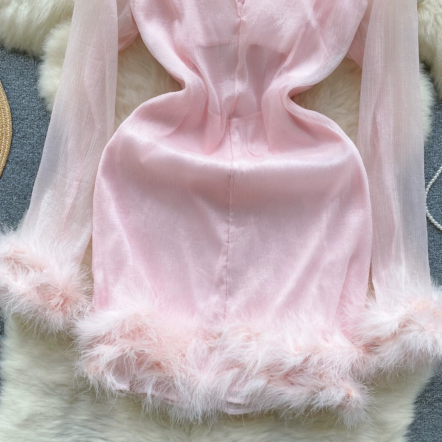軽くて高級感のあるハーフハイカラードレスレディース。メッシュフェザーミルキー甘い雰囲気デザインニッチスーパーフェアリー気質スカート 大人ガーリー スウィート キュート カジュアル lyxaj76518008111