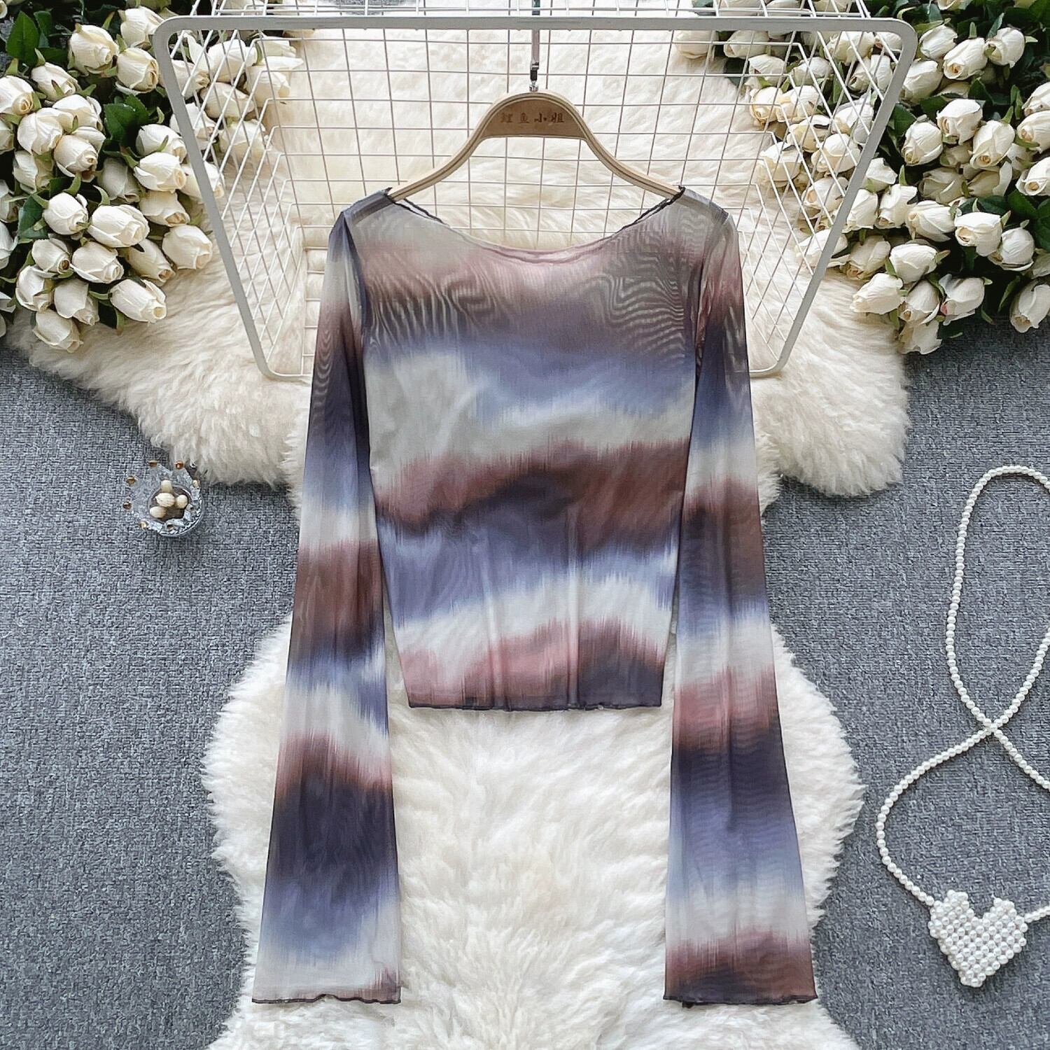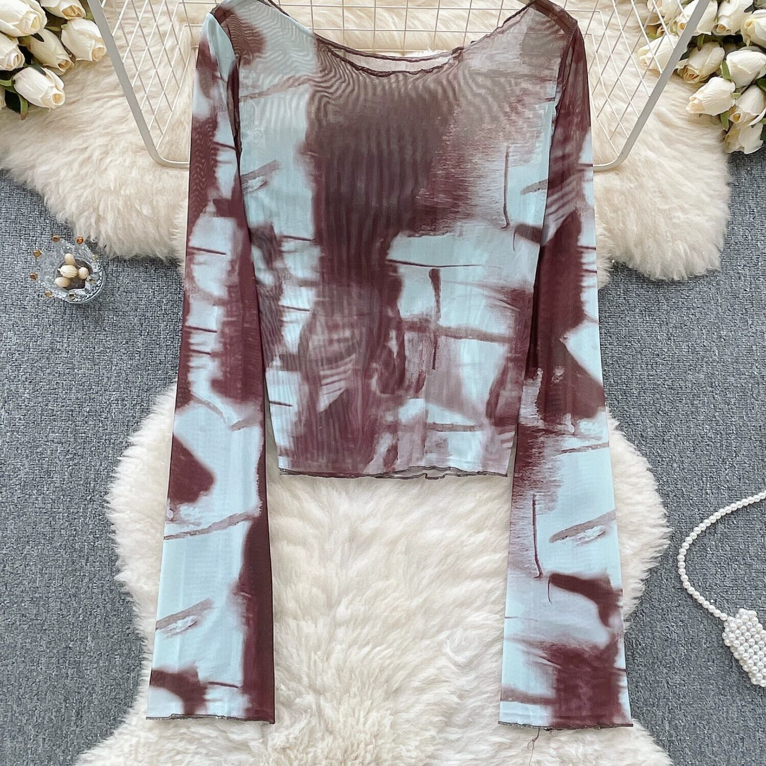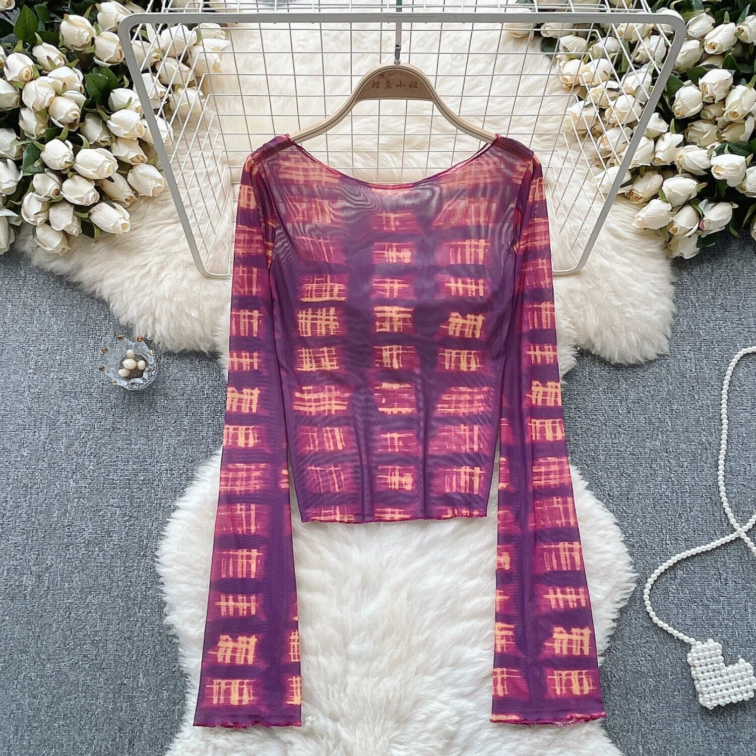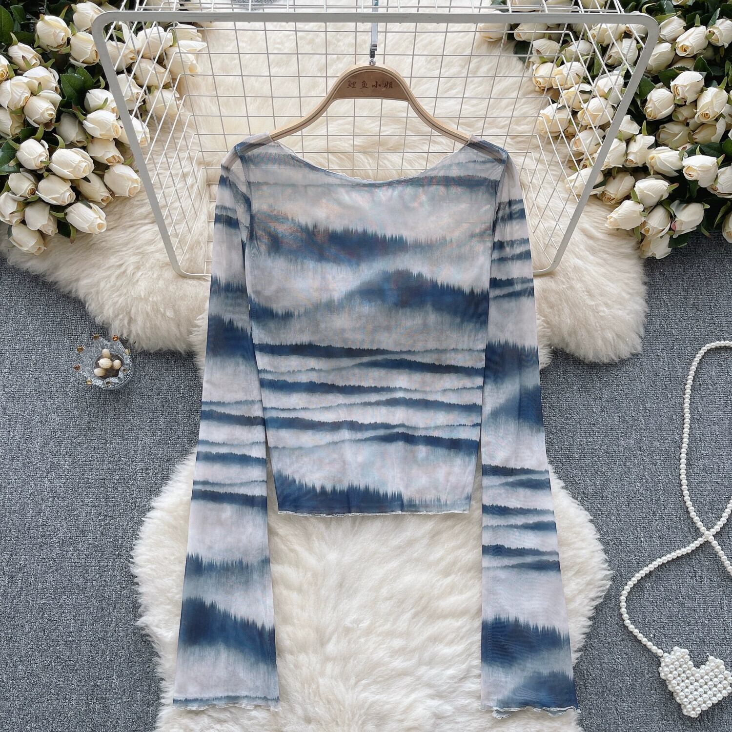 レトロアメリカン純粋な欲望スタイルのガーゼプリントTシャツレディース夏タイトショート長袖トップ、ユニークなデザイン ロング サマー 夏物 ピュア lyxaj10576934551