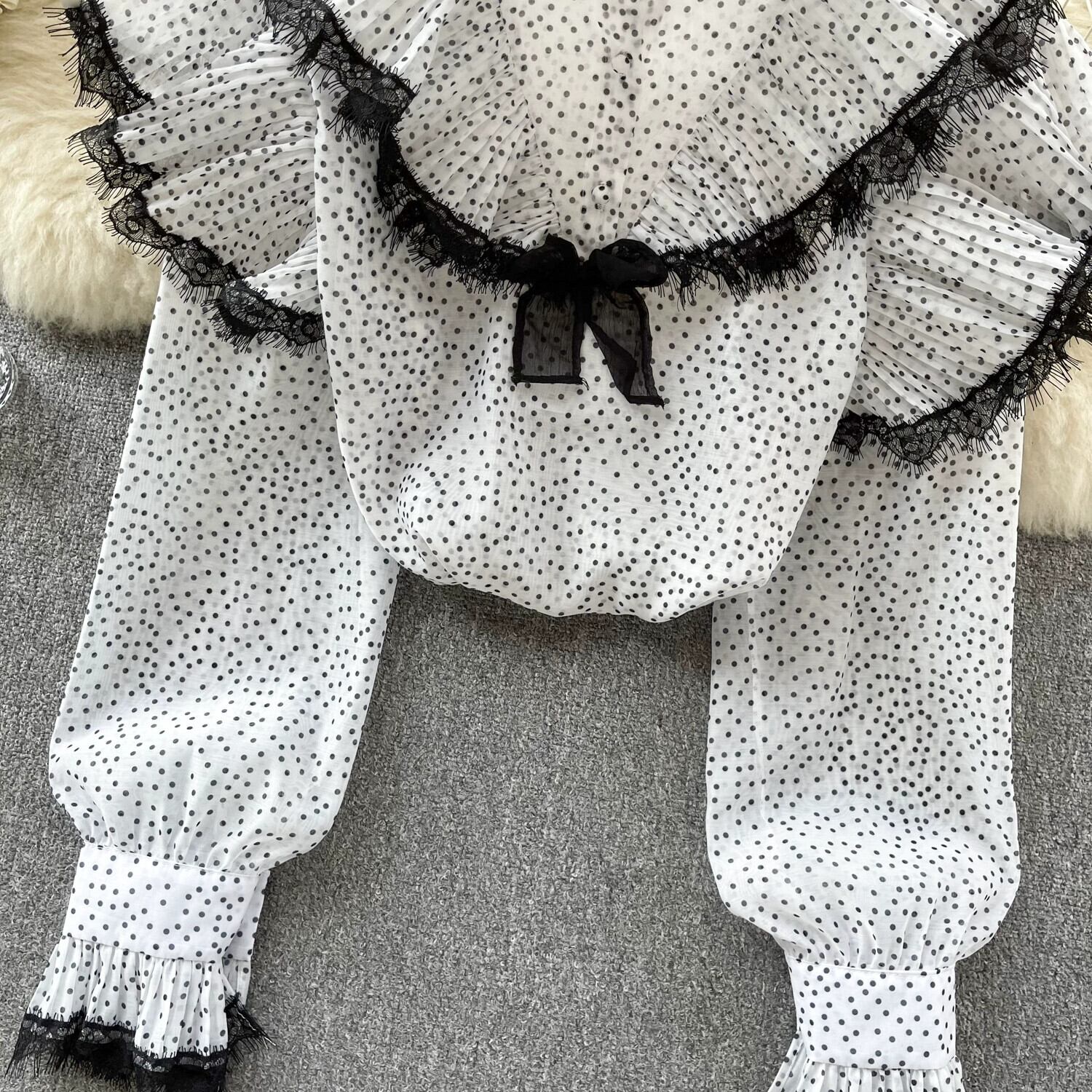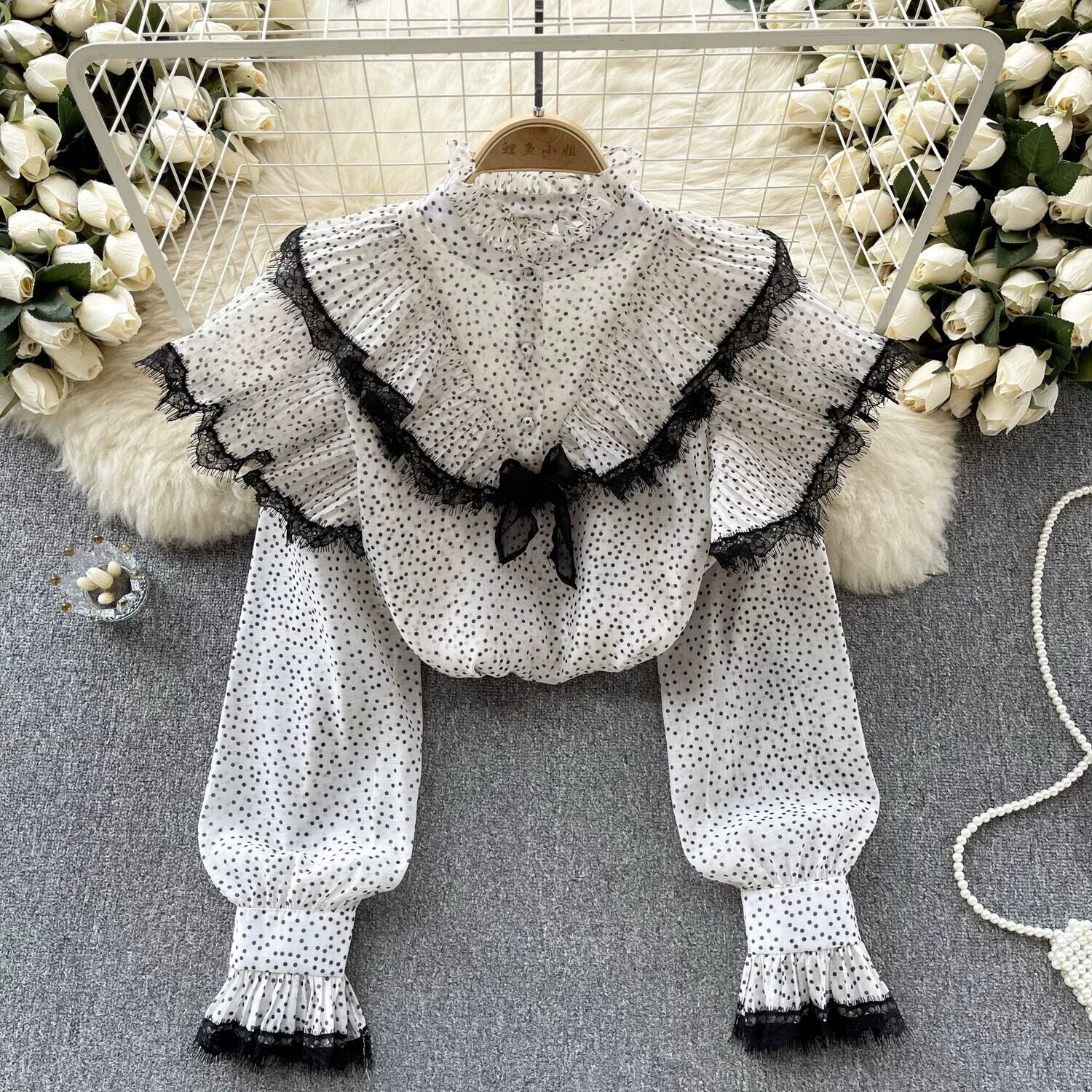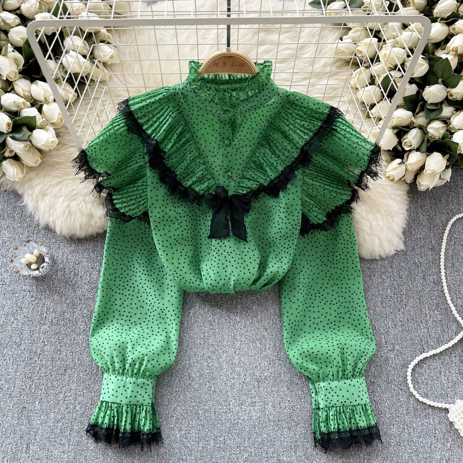 シフォン シャツ デザイン、レース、プリーツ フリル、年齢軽減、万能スタンドカラー シャツ、ポルカドット長袖トップ ロング ラッフル lyxaj52627844137