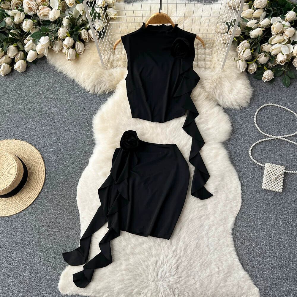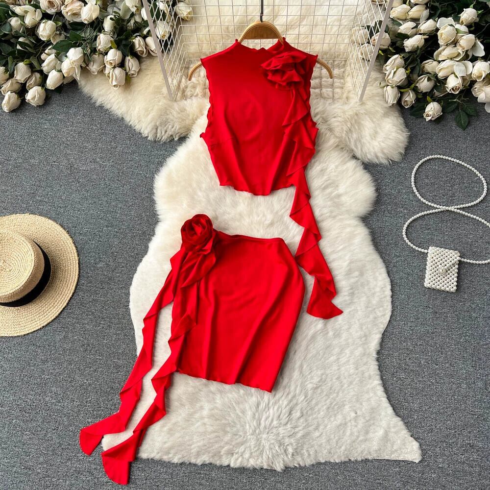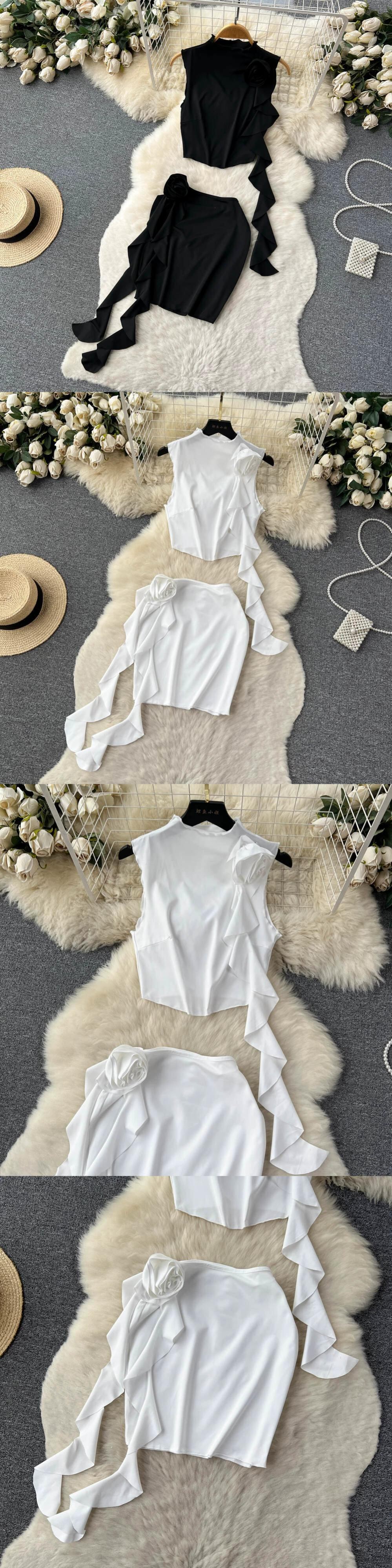 ホットセクシーな純粋な欲望スーツ女性ノースリーブ菌ショートトップ + 立体フラワーヒップスカートツーピース夏セット サマー 夏物 ピュア フラワーデザイン lyxaj45762366939
