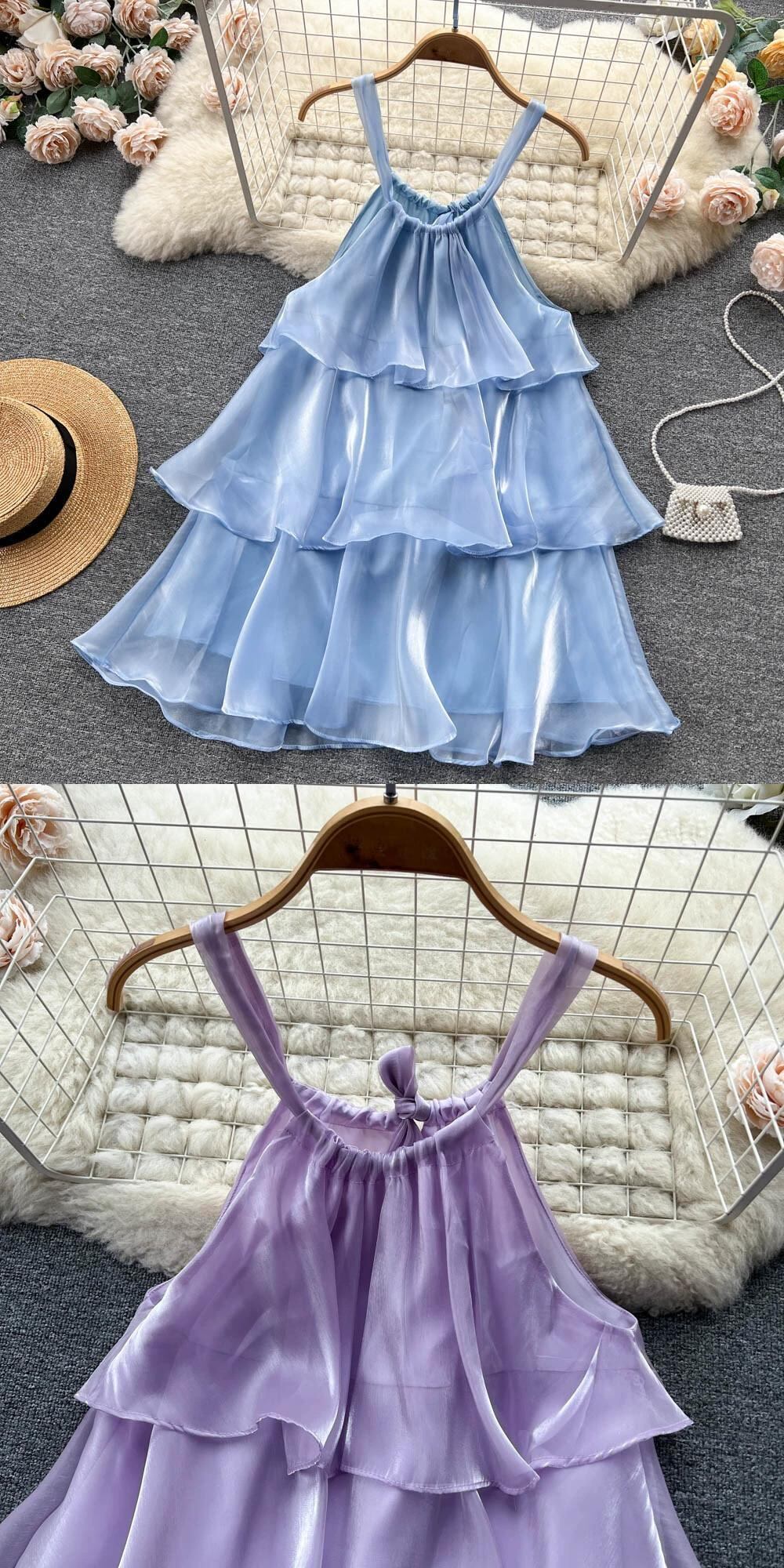甘いエストスタイルオーガンザメッシュ優しいスタイルフリルホルターネックドレス女性ノースリーブルーズサスペンダーショートスカート 大人ガーリー スウィート キュート カジュアル lyxaj54691342665