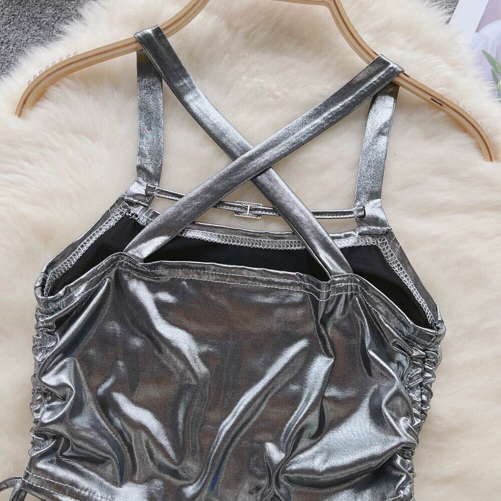 ホットセクシーな pu レザーキャミソール女性の夏の新しいスタイルのインナー巾着ストラップ不規則なショートトップトレンディな サマー 夏物 lyxaj57594526908