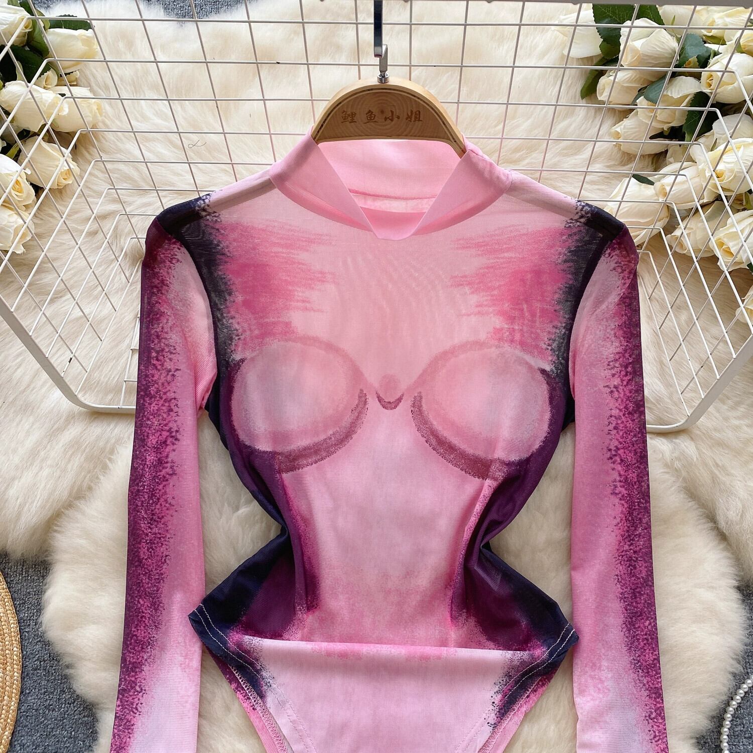 ヨーロッパとアメリカのワンピーストップス、ニッチデザイン、グラデーションカラープリント、スリム、ハーフハイカラー、長袖Tシャツボトムス ロング ヨーロピアン lyxaj68843076238