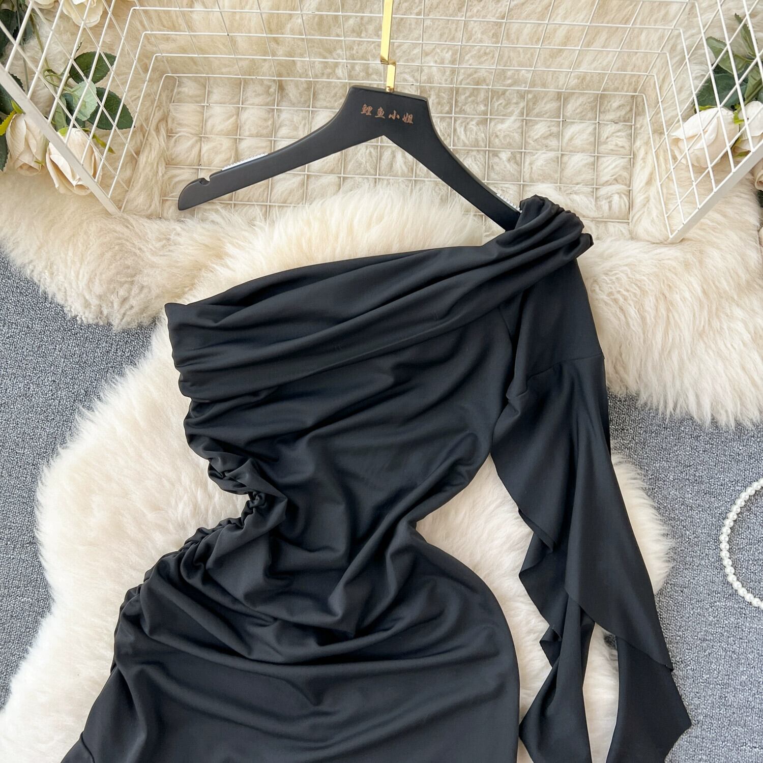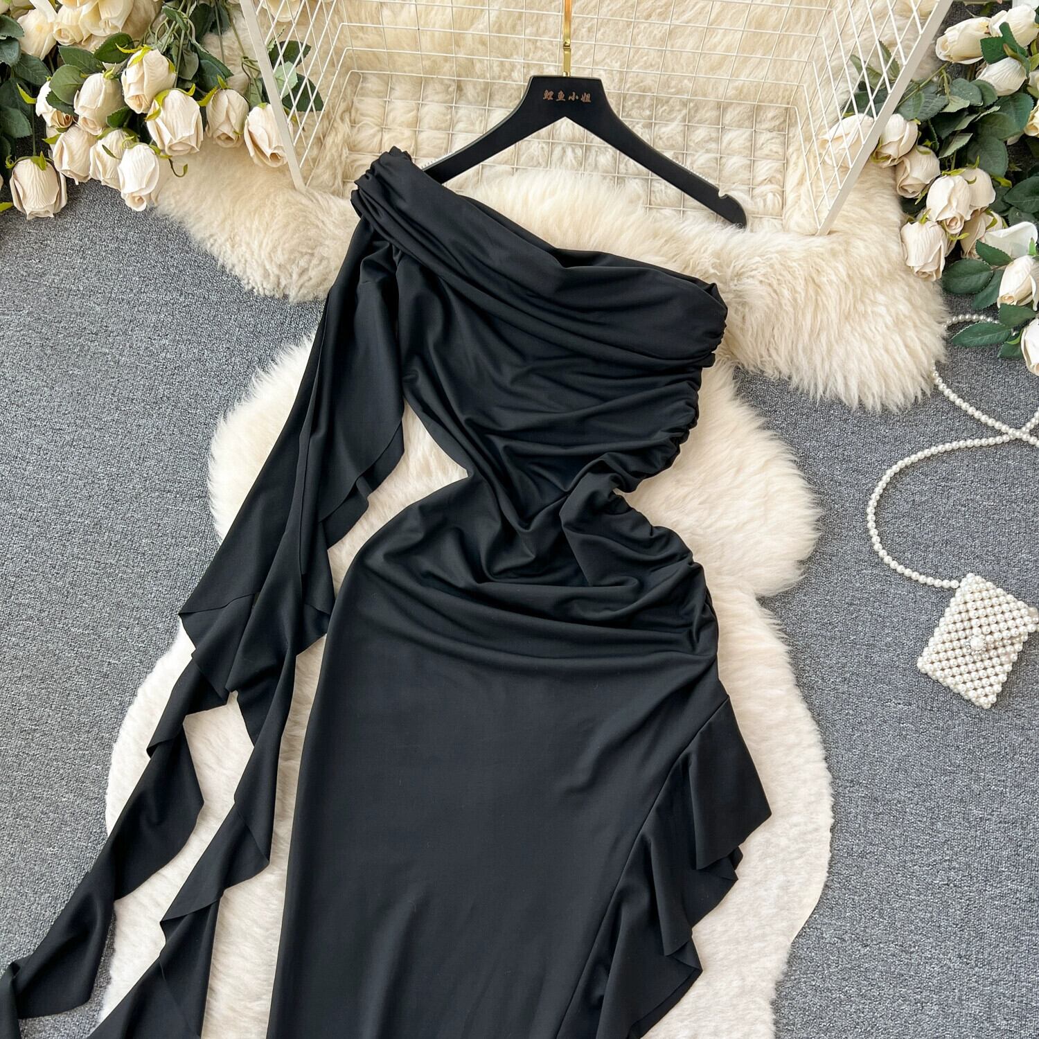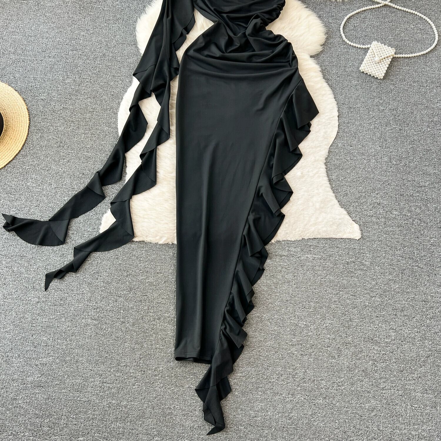 ヨーロッパとアメリカンスタイルの軽い高級ハイエンド斜め襟ドレスレディースサマーストリーマーフリルデザインスリットロングスカート 夏物 ヨーロピアン lyxaj42069795074